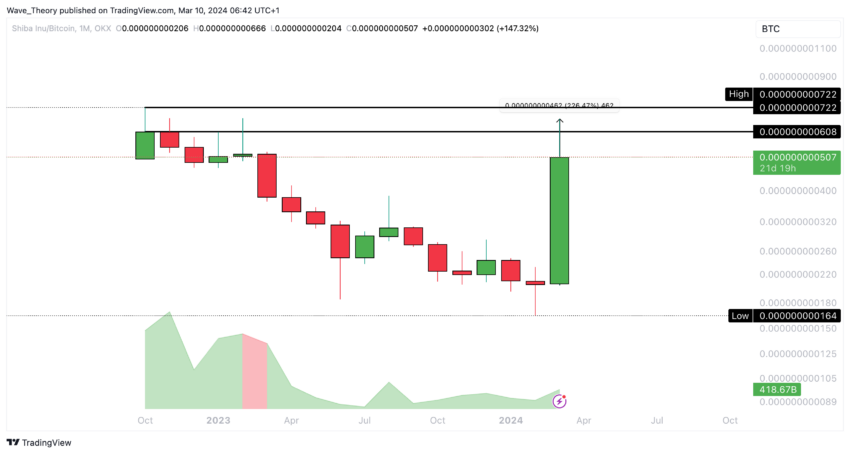 BTCに対して、Shiba Inuは10日間で約226%の急騰を記録した。この急騰により、SHIBは約0.0000000006 BTCから0.000000000722 BTCまでの実質的なレジスタンスに直面することになる。
