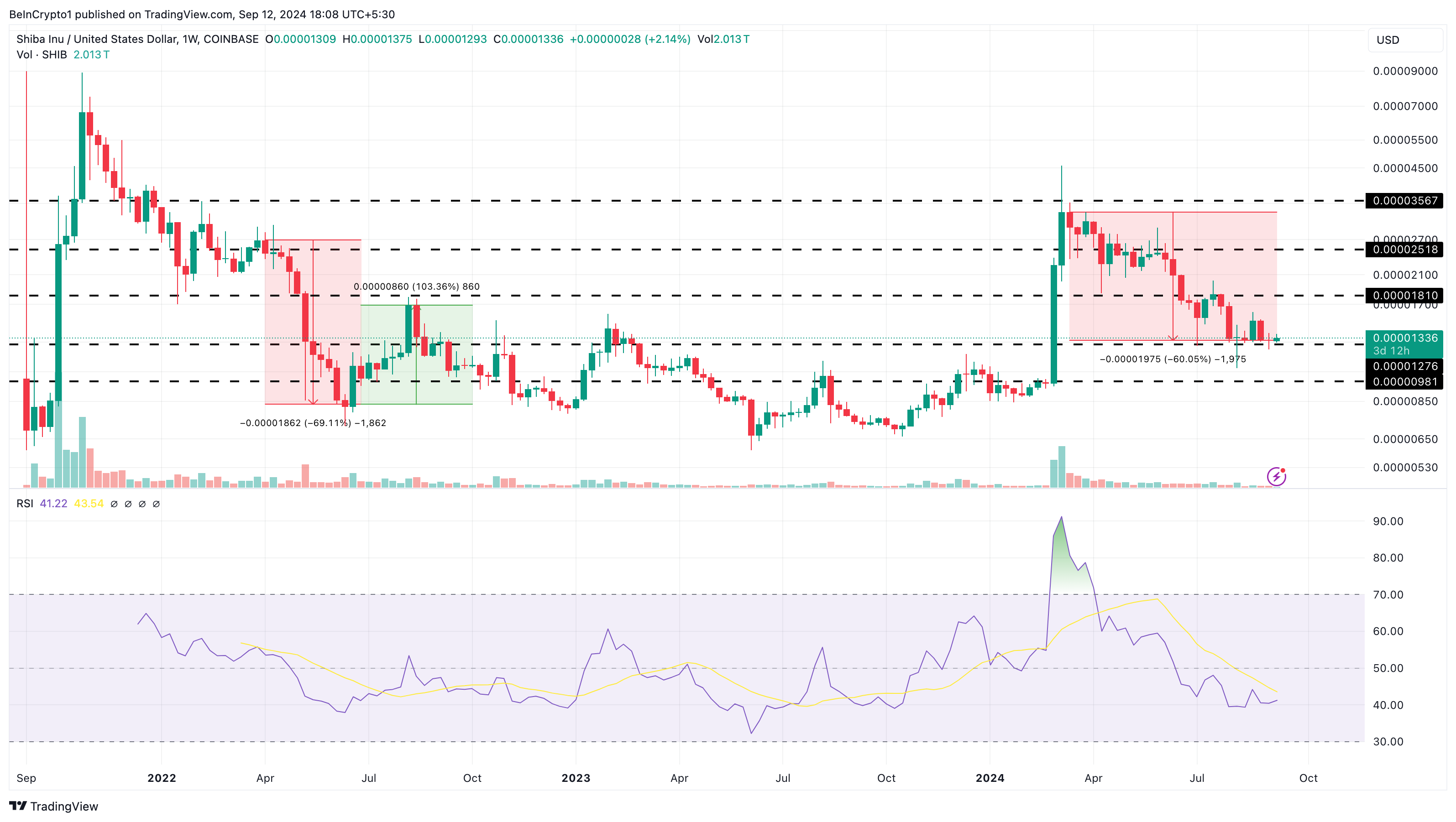 週足チャートの分析によると、SHIBは、価格が急落した後、0.000027ドルに上昇するのに苦労した2022年4月の同様のパターンを反映しているように見えます。現在、SHIBは0.000013ドルで取引されており、相対力指数(RSI)は勢いが弱まっていることを示しており、トークンに対する強気のセンチメントが不足していることを示唆しています。