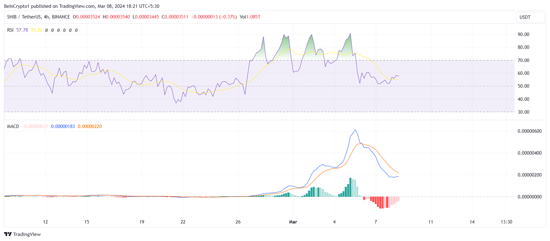 柴犬コインの価格は大きな伸びを描いてきたが、ここ3日間でその伸びは鈍化している。3月5日以降、相対力指数(RSI)と移動平均収束ダイバージェンス(MACD)は弱気な展開を観測している。