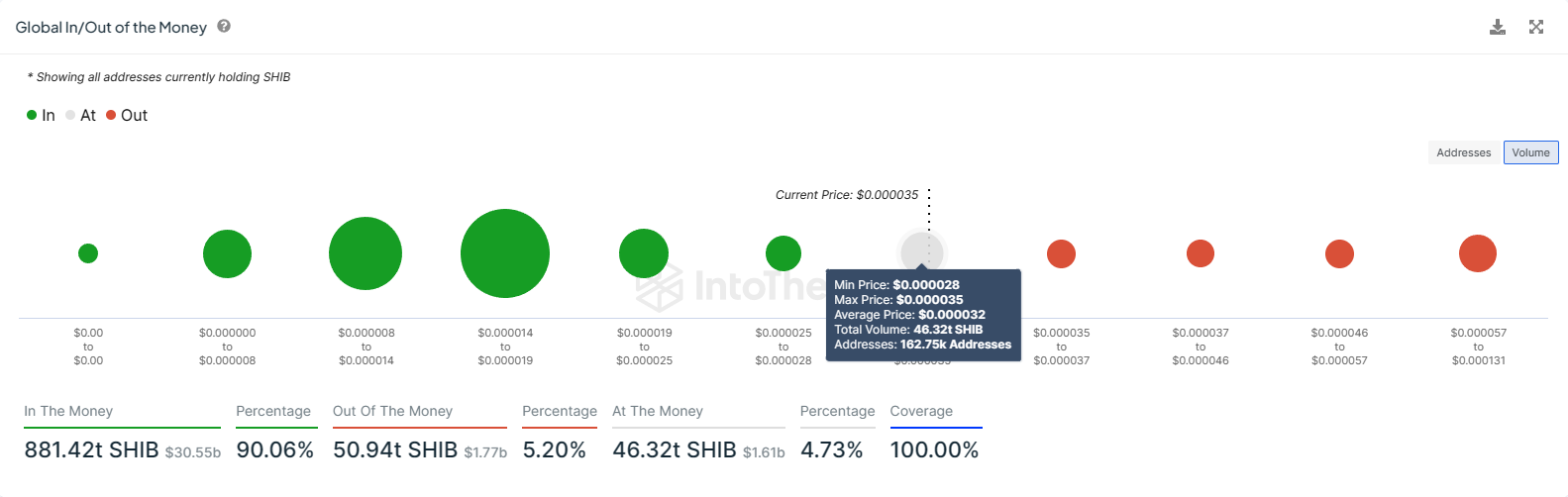 0.00002800ドルから0.00003599ドルの間に約46兆3200億ドル相当のSHIBトークンが買われたため、この障壁は重要である。このレベルがサポートに反転すれば、供給全体が利益を生むことになる。