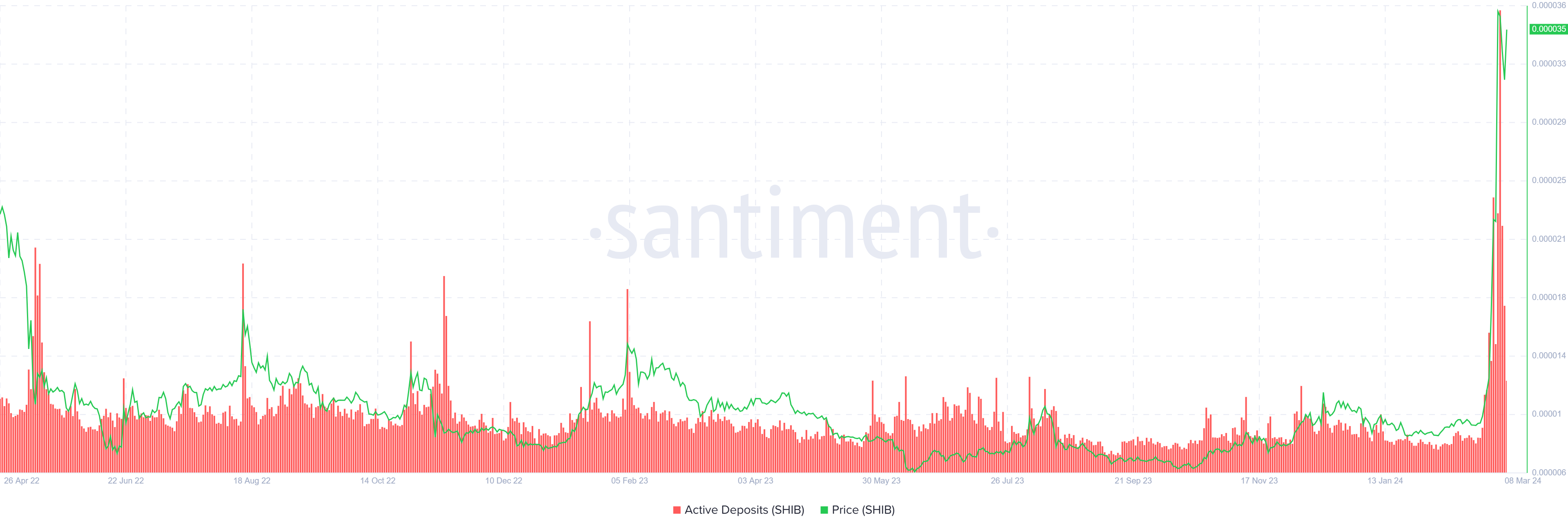 また、柴犬投資家は保有株を手放すことで利益を確定しようとしている。利益確定は一般的に、トークンが取引所アドレスに移動することで示され、同じことがアクティブ・デポジットで示されたスパイクで示すことができる。