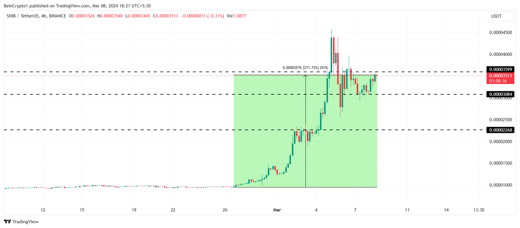 柴犬コイン価格は現在0.00003513ドルで取引されており、過去2週間で271%の上昇を記録している。上記の状況が値動きに影響する場合、0.00003084ドルまでドローダウンする可能性がある。しかし、現時点でのミームコインは、0.00003599ドルのレジスタンスレベル突破に近づいている。