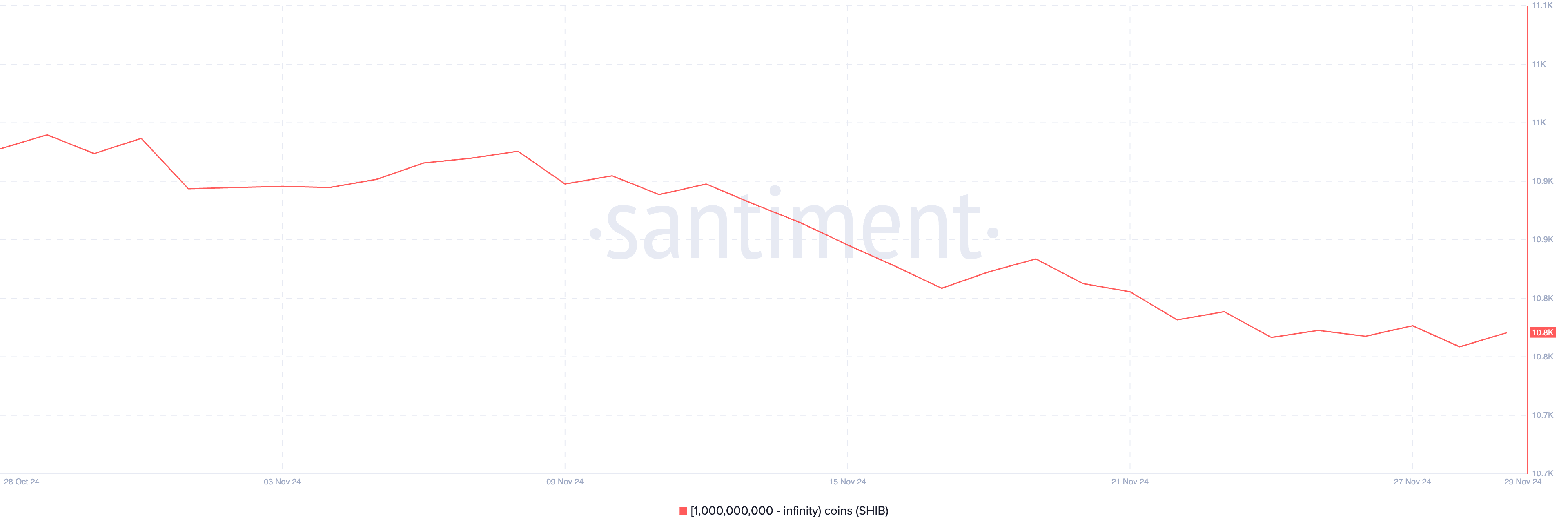 10億以上のSHIBを保有するウォレットが11,013から10,858に減少したことは、わずか1か月で155の主要保有者の損失を示している。この大口から小口へのトークンの分配は通常、売り圧力を生み出し、上昇傾向の弱まりを示す可能性がある。