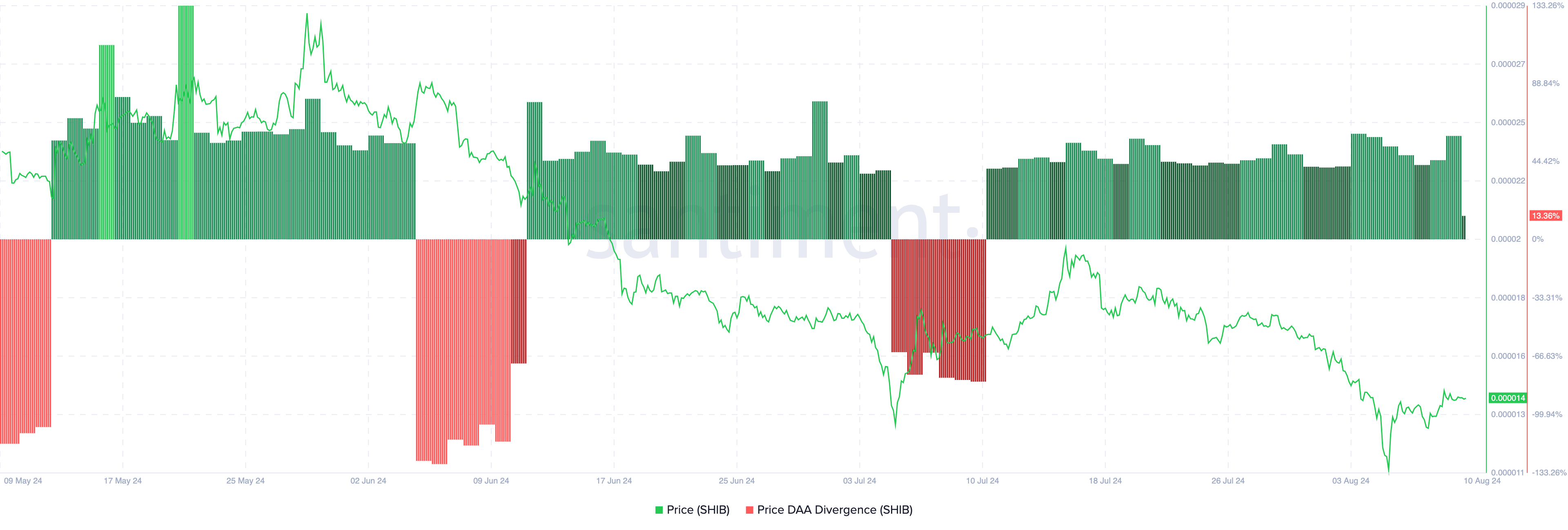 Santimentのオンチェーンデータは、柴犬の価格DAA乖離を調べた。この指標のDAAはDaily Active Addressesの略で、ブロックチェーン上のユーザーの参加率を測定します。この指標が上昇すれば価格上昇の可能性が高まり、逆に低下すればそうでないことを示唆します。