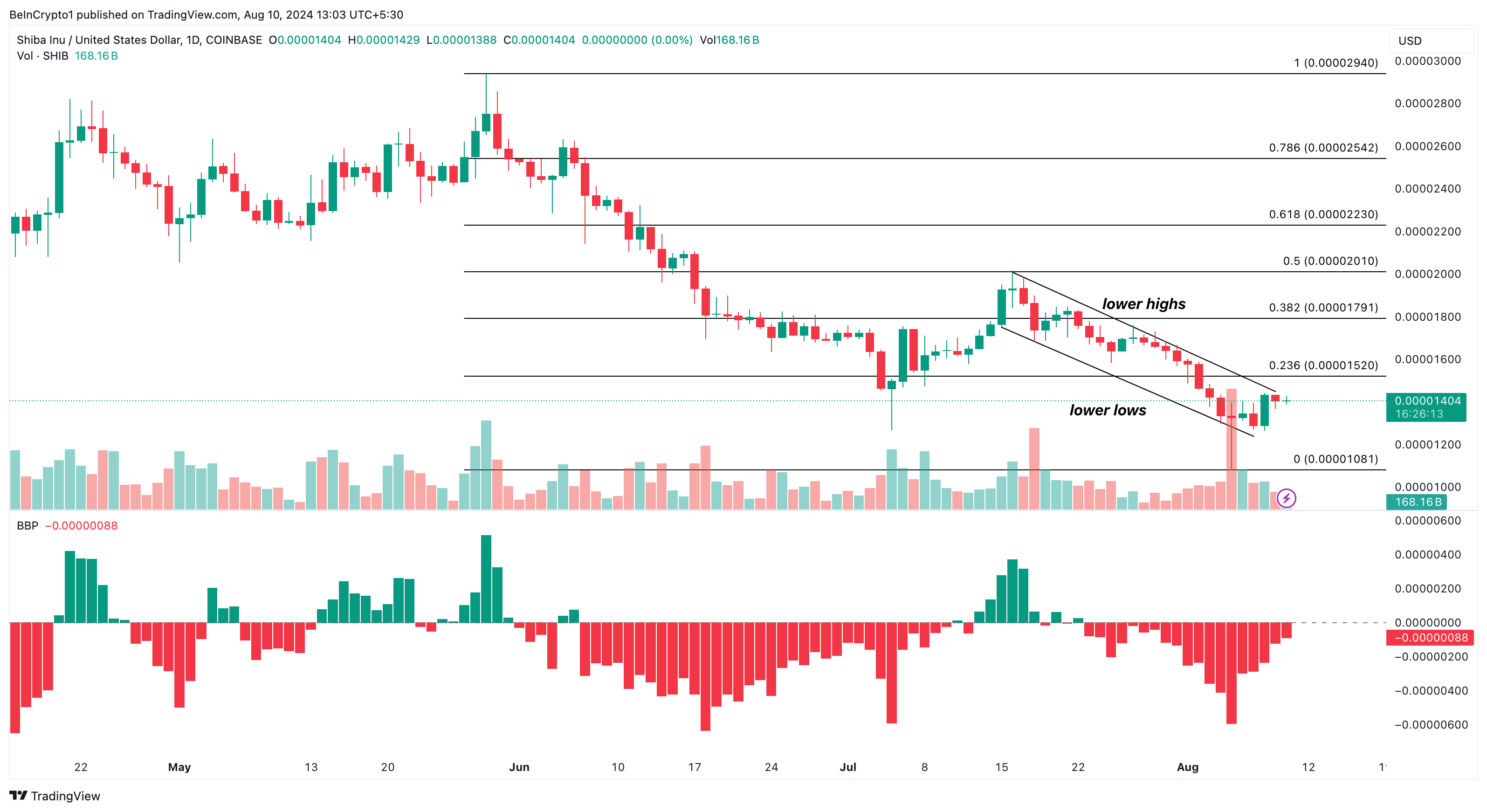 日足チャートによると、SHIBは7月中旬から8月7日にかけて下降チャネルを形成した後、1日後にわずかに反発した。下降チャネルは、2本の下降トレンドラインが下降高値(レジスタンス)と下降安値(サポート)にぶつかったときに出現し、弱気継続を示す。