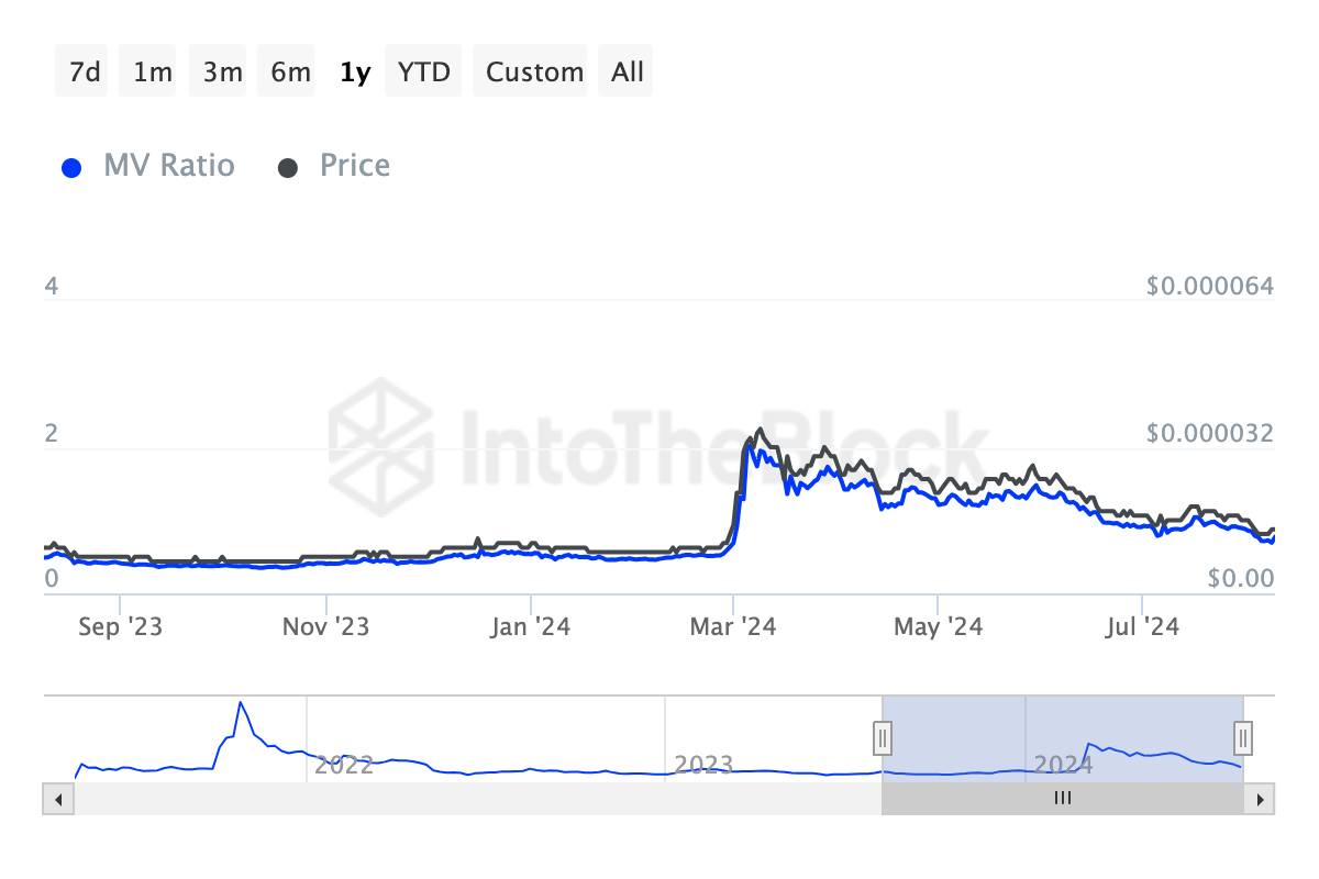 上記の通り、SHIB の場合の比率は 0.69 です。これは、利益よりも含み損の方が大きいことを示しています。従って、過去のデータにも裏付けられ ているように、顕著なバウンスが現れる前に、ここは積み増しスポットとなる可能性がある。