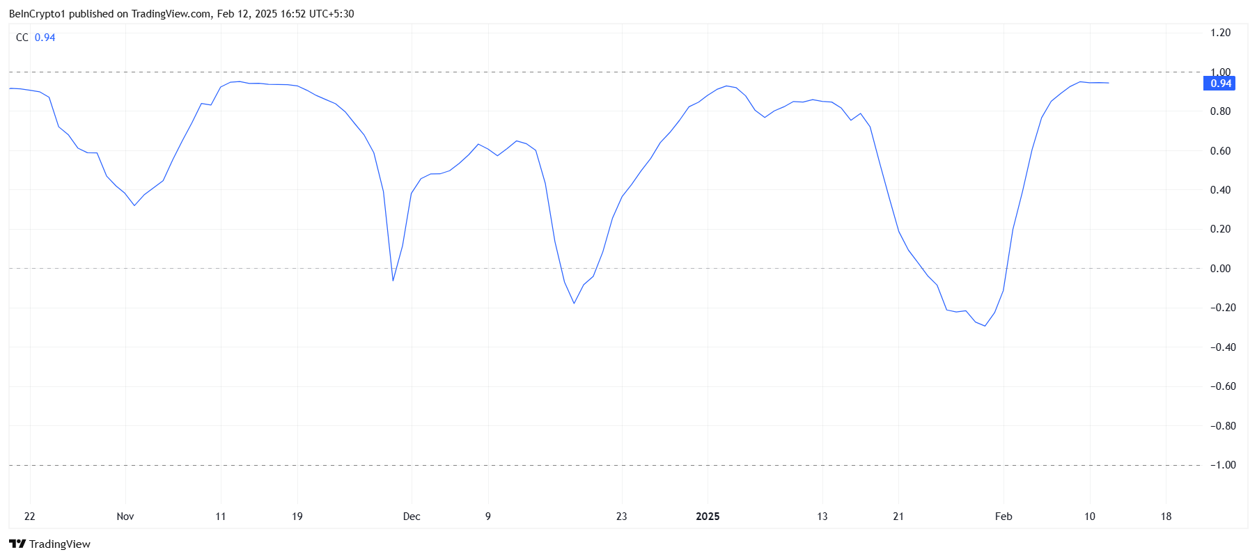 柴犬コインはビットコインと強い相関関係を持ち、相関係数は0.94である。これは、ビットコインが強さを示し続ける場合、SHIBがビットコインの価格動向に従う可能性があることを示唆している。ビットコインが重要な10万ドルの壁を突破すれば、暗号資産市場全体、特に柴犬コインにとって成長の時期を示す可能性がある。