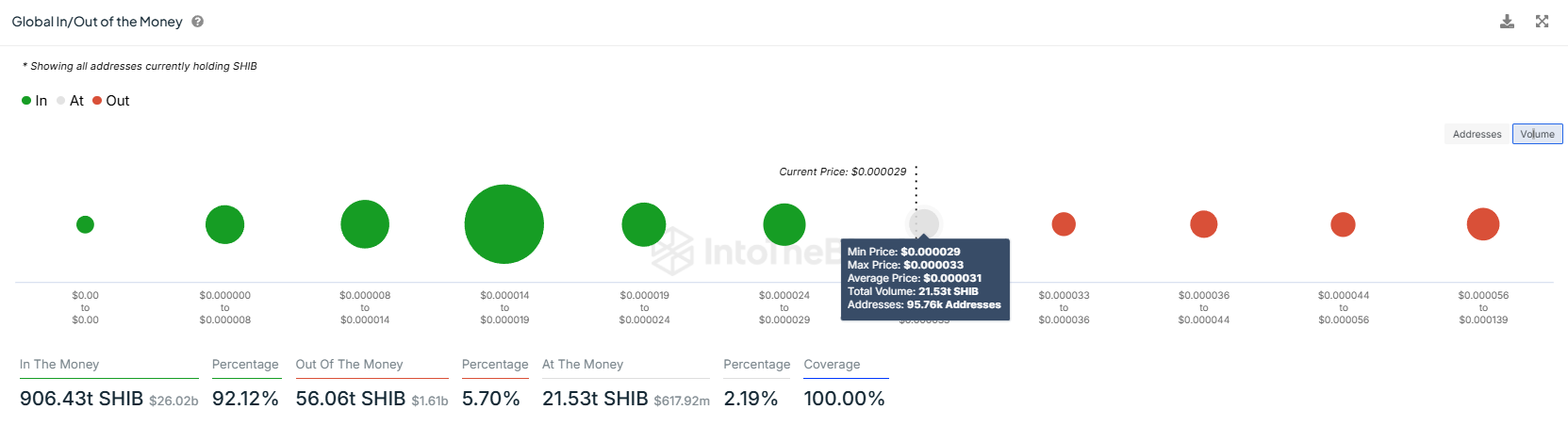 GIOM(Global In Out-of-the-Money)指標によれば、約21.53兆SHIBトークン、660百万ドル以上の価値が利益を得る寸前である。これらのトークンは、$0.00002900から$0.00003300の価格範囲で取得された。これらの保有者が利益を確保するためには、柴犬コインが上昇傾向を続ける必要があるーだ。