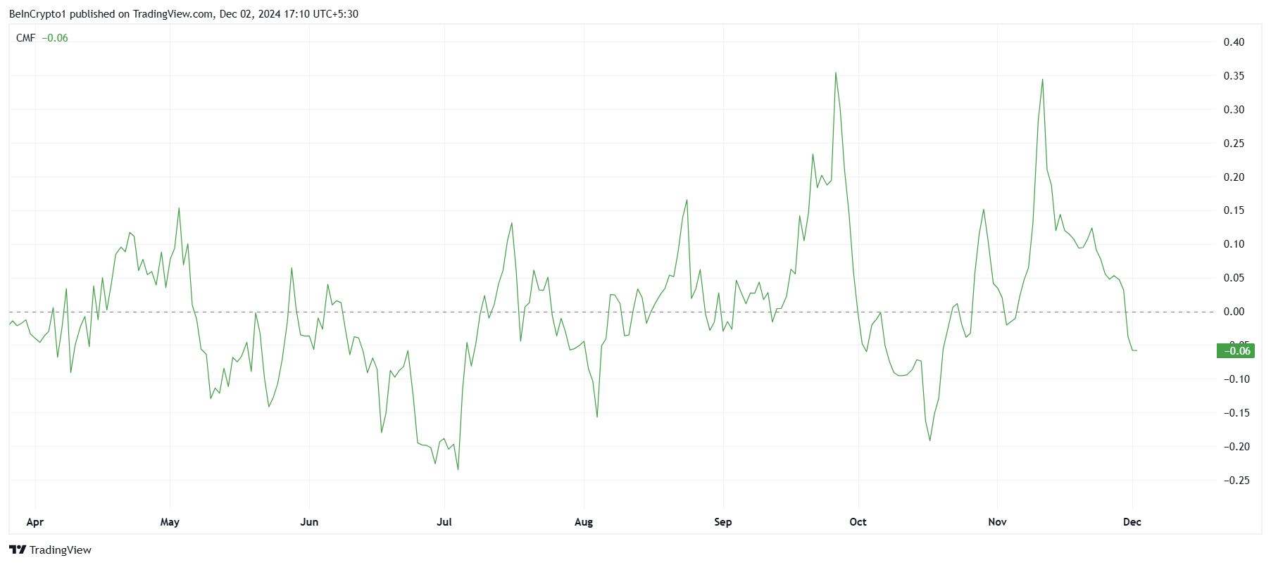 市場全体の感情は混在しており、技術指標は柴犬コインに対して警告信号を示している。チャイキン・マネー・フロー(CMF)は顕著なダウントレンドを示し、中立ラインを下回ったーだ。