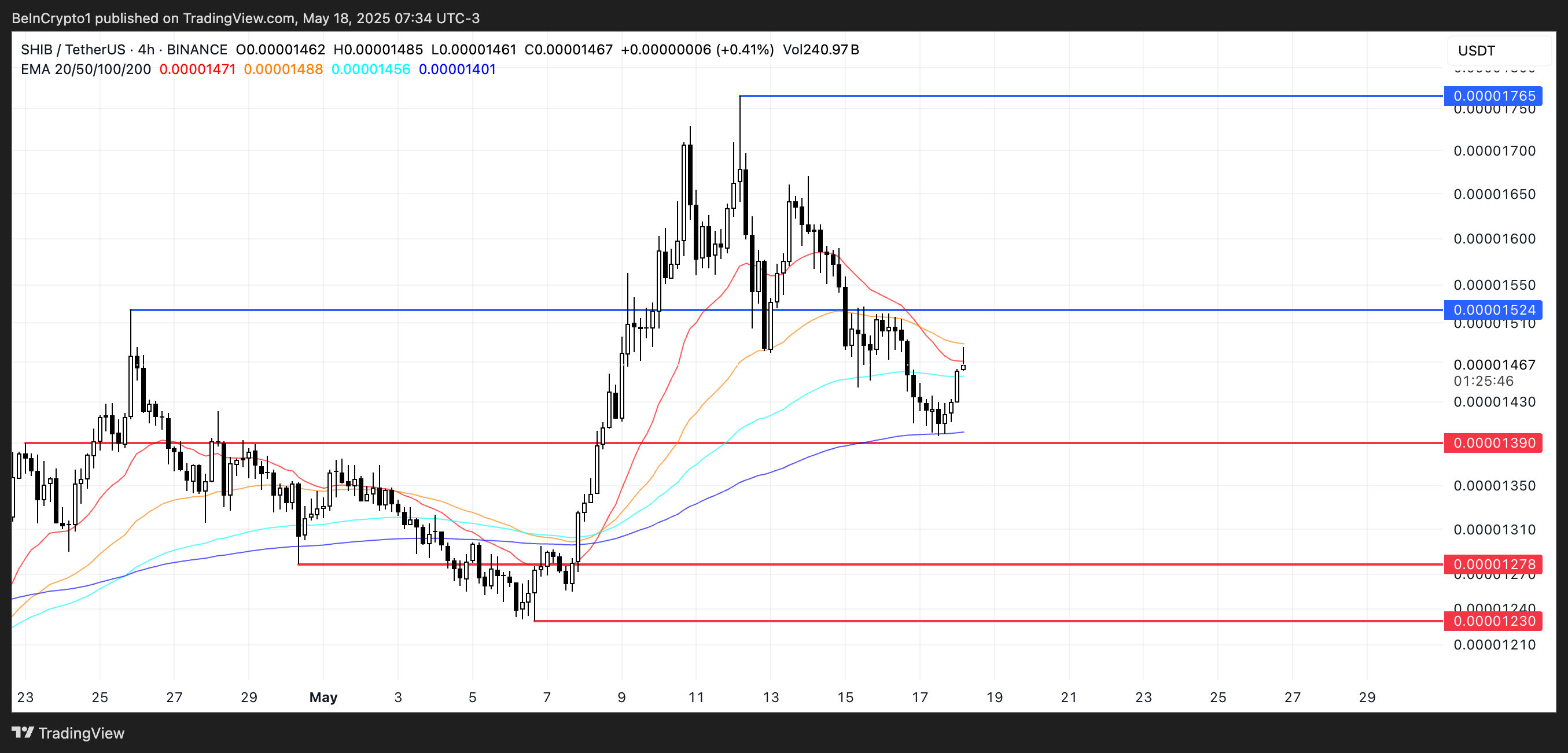 しかし、買い手が再び参入し、今月初めに見られた勢いを取り戻すと、0.0000152ドルを超えるブレイクアウトが次の抵抗近くの0.0000176ドルに価格を押し上げる可能性がある。