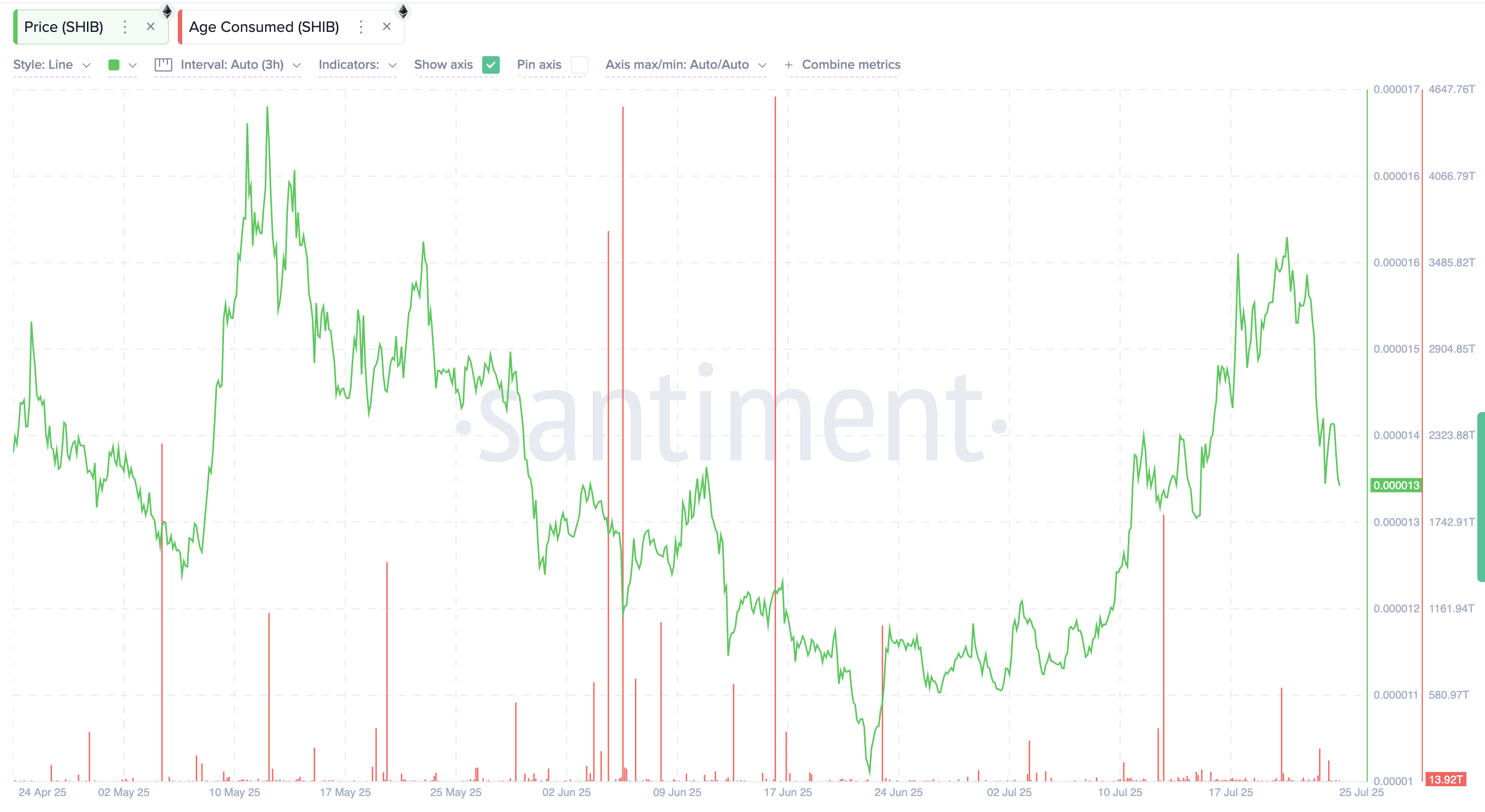 歴史的に、SHIBのローカル価格は5月と6月にAge Consumedの急上昇と一致してピークを迎える。しかし今回は何かが違う。
