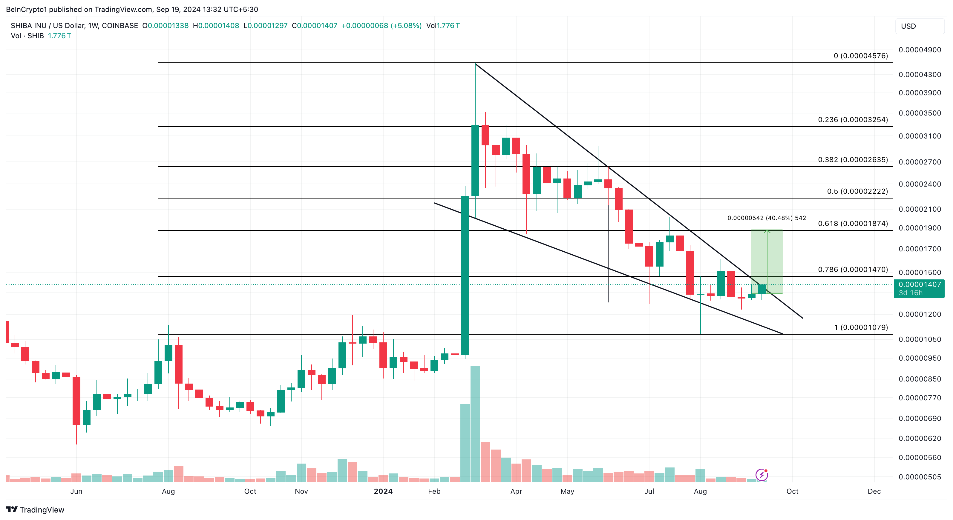 SHIBの価格予測をより明確に把握するために、BeInCryptoは週足チャートを調査します。分析によると、ミームコインは下降ウェッジを形成しており、これは価格が0.000032ドルに達した3月の年間最高値にまでさかのぼります。