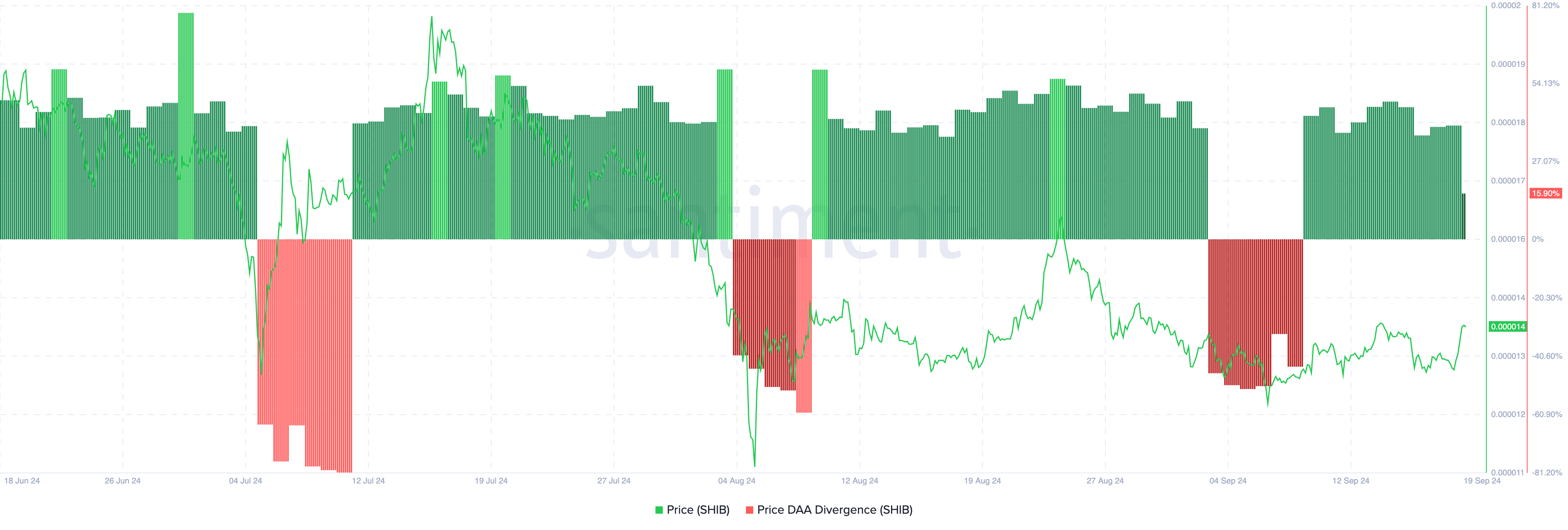 しかし、以下に示すように、柴犬コインの価格とDAAの乖離は15.90%でプラスに転じています。これは、最近の上昇トレンドがネットワーク活動の増加に支えられていることを示しています。したがって、SHIBは価格が現在のレベルよりも高くなる可能性があるため、購入の機会を提供します。