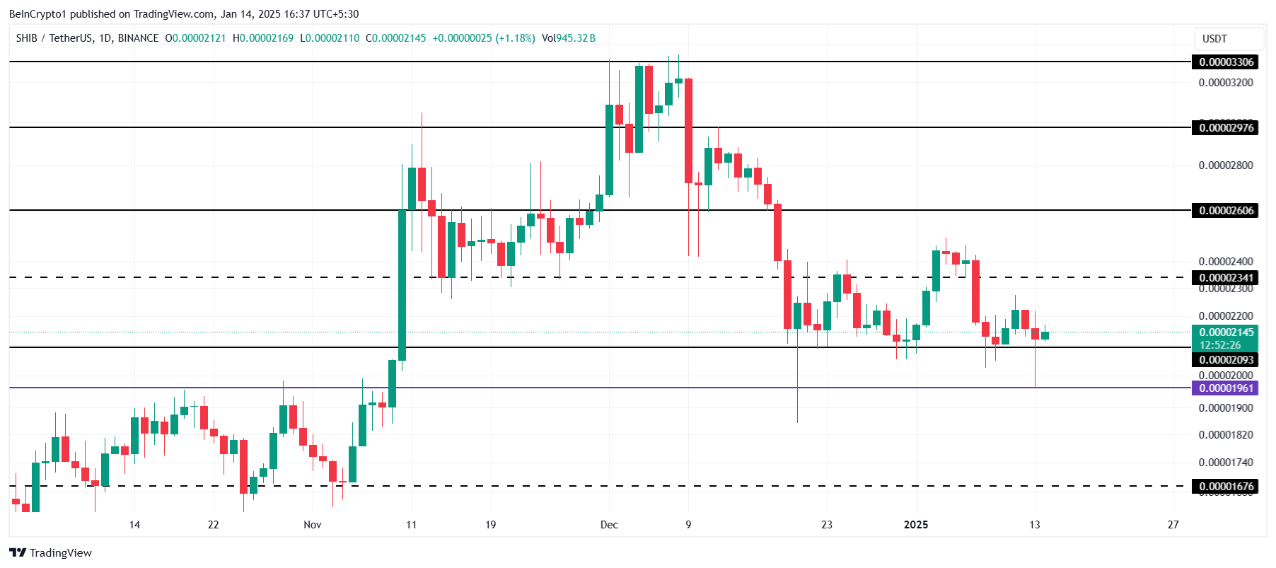 柴犬コイン(SHIB)は、重要なサポートレベルである0.00002093ドルの上で統合しており、ブレイクアウトしてラリーを投稿するのに苦労しています。