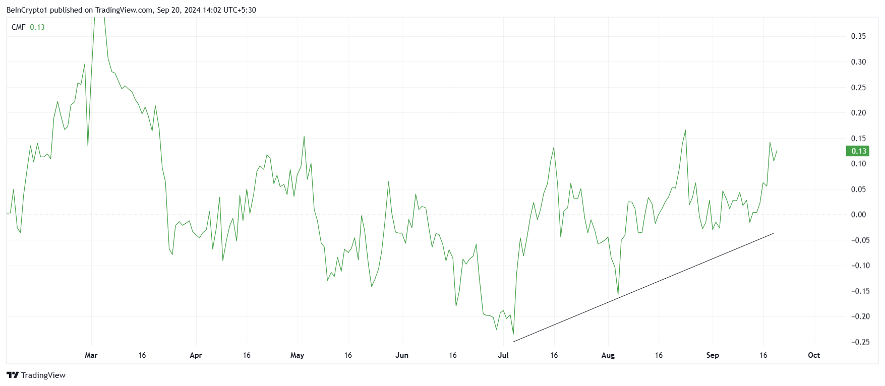 柴犬コインのマクロ経済の勢い は、ポジティブな兆しを見せています。チャイキン・マネーフロー(CMF)指標は7月以降一貫して増加しており、8月中旬にはより強い流入が観察されました。
