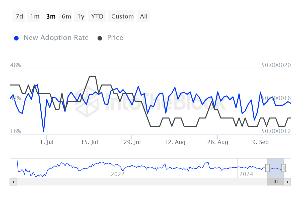 また、Shiba Inuの価格変動にもかかわらず、採用率は32%と安定しており、強い牽引力を示しています。このメトリックは、すべてのアクティブ アドレスのうち新しいアドレスが最初のトランザクションを行う割合を計算し、SHIBに対する持続的な需要を示しています。