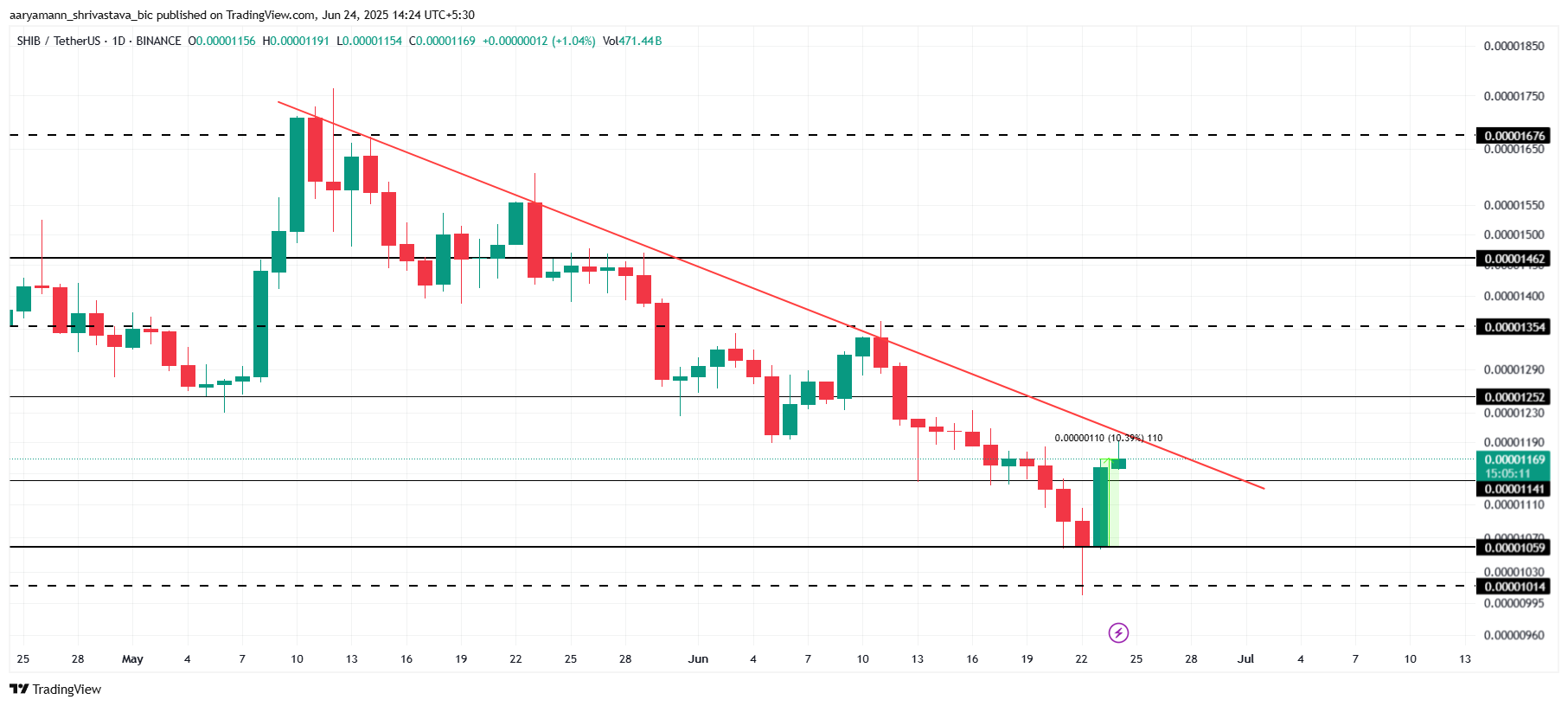 現在、柴犬コインの価格は0.00001169ドルで取引されており、過去24時間で10%のわずかな上昇を見せている。このアルトコインは0.00001141ドルをサポートとして確保しようとしている。SHIBがこのレベルを維持できれば、短期的な安定点を示す可能性があるが、0.00001200ドルを超える持続的な上昇は、既存の抵抗のために依然として大きな課題である。