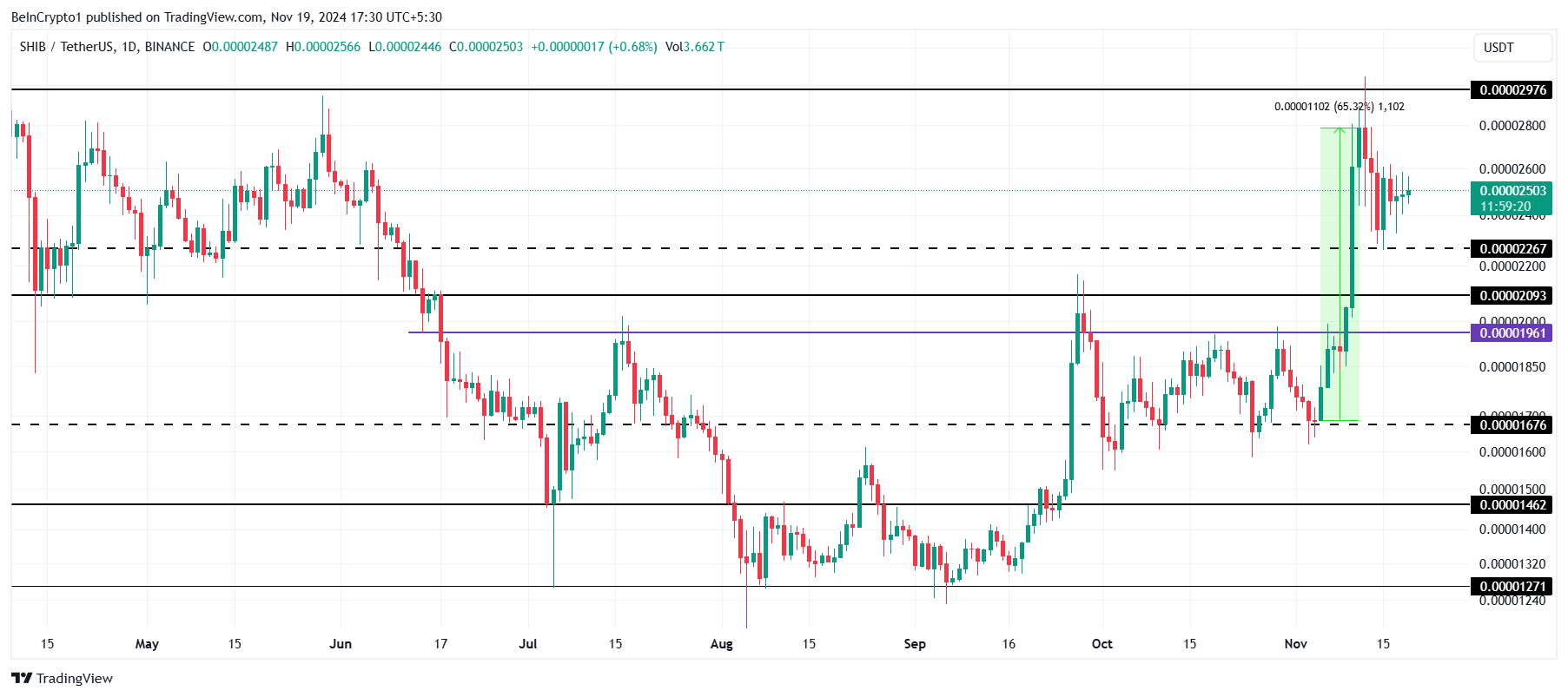 柴犬コインは11月に入り、65%の急騰を記録した。しかし、その上昇トレンドは抵抗に遭い、さらなる上昇の試みが停滞している。