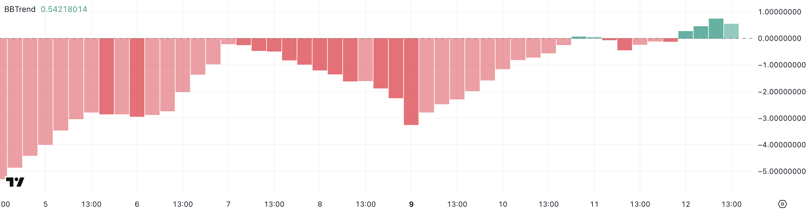 BBTrend、またはボリンジャーバンドトレンドは、ボリンジャーバンドに対する価格変動の方向性の強さを測定する。0以上の値は上昇モメンタムを示し、0以下の値は弱気トレンドを示す。