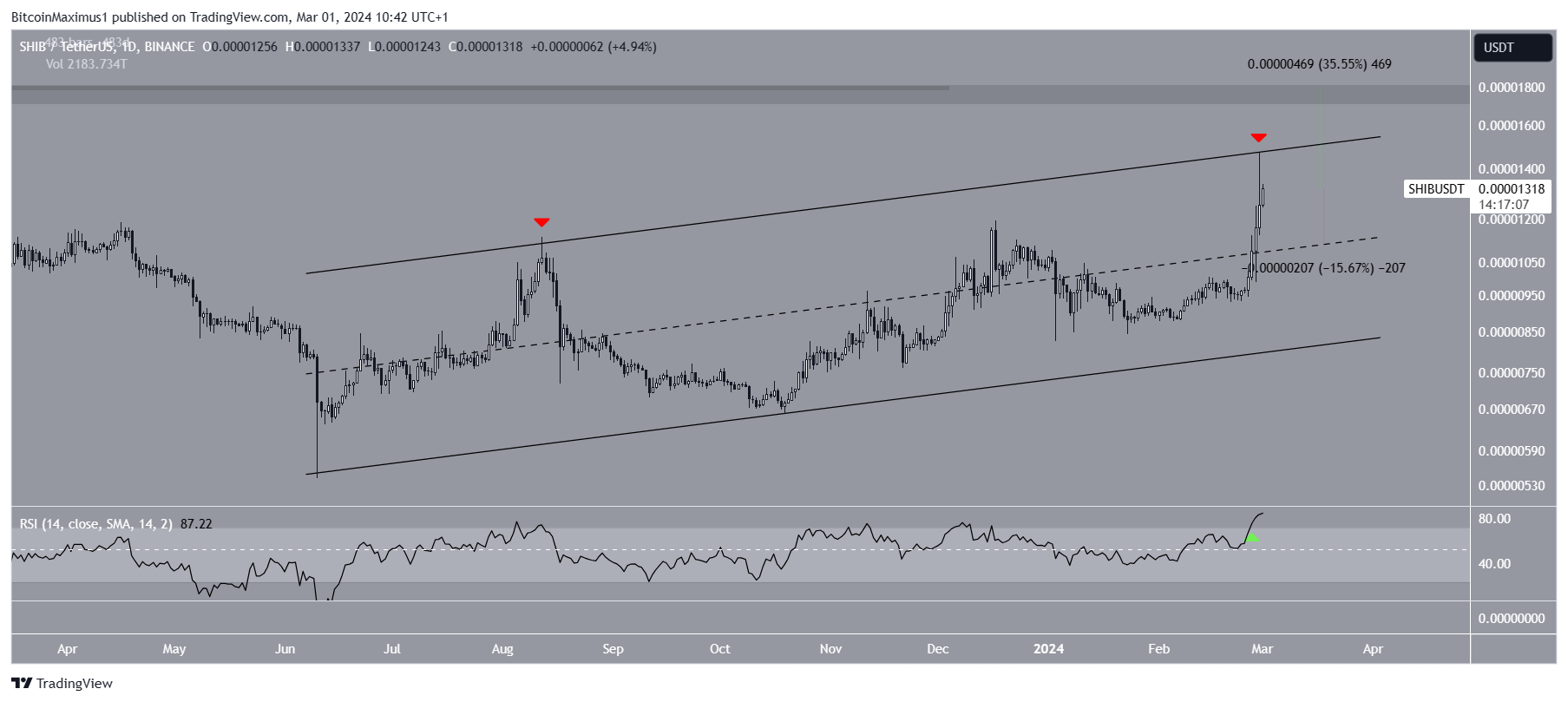 2月20日、SHIBはこの巨大な抵抗帯を突破し、わずかに下落する前に0.00000147ドルの高値をつけた。これは2023年2月以来の高値であり、SHIBはまだこれを上回る週終値に到達していない。