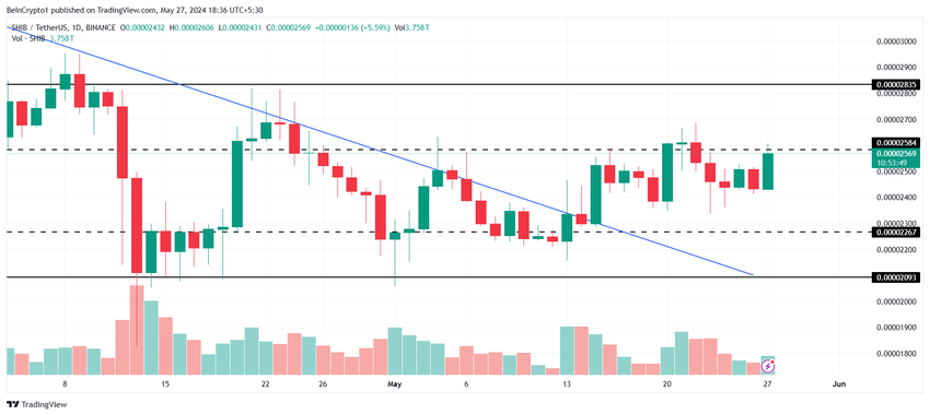 一方、ブレイクダウンまたはブレイクアウトは、統合テーゼを無効にする。上昇すれば、SHIBは0.00002835ドルまで上昇し、下落すれば、ミームコインは0.00002093ドルまで下落する可能性がある。