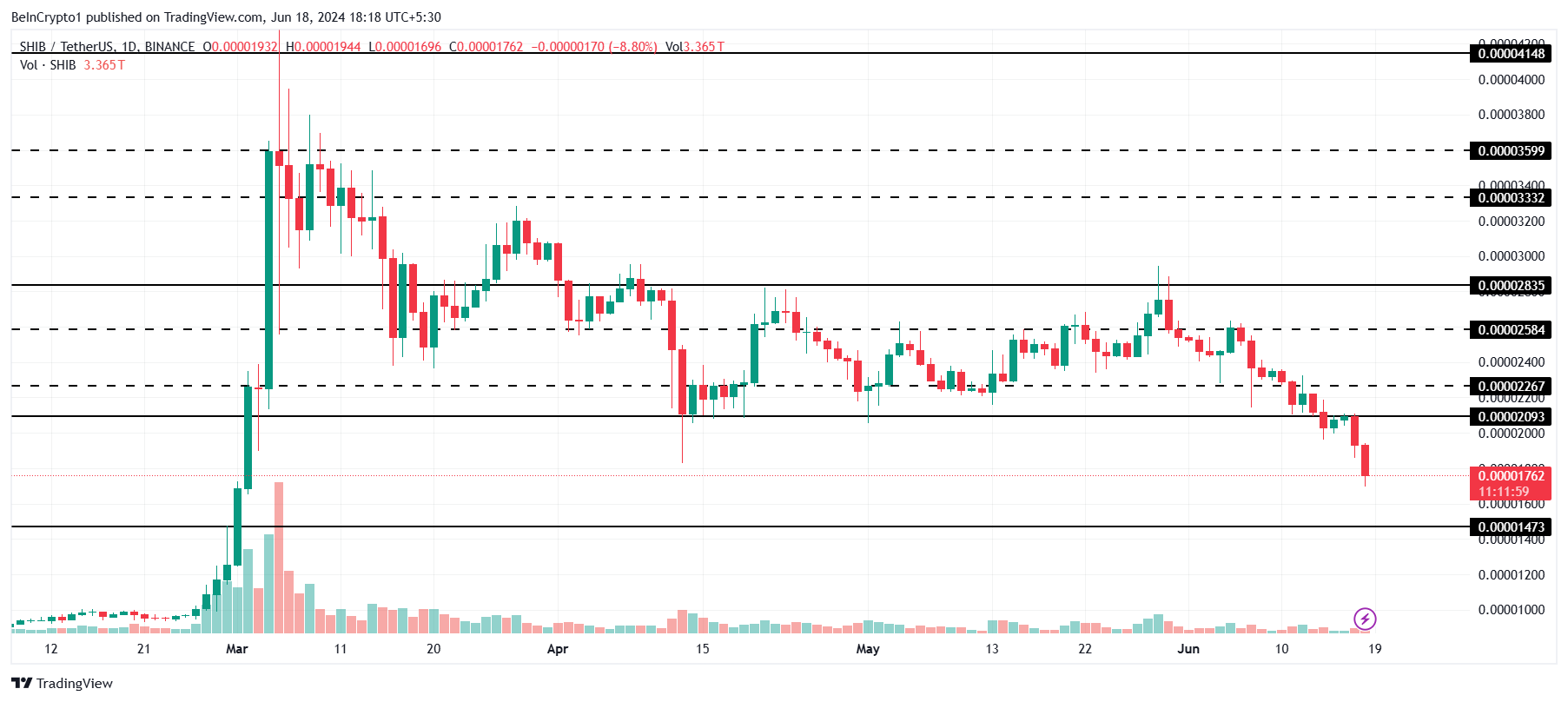 柴犬コインの価格はすでに0.00002000ドルを割り込み、現在0.00001762ドルで取引されている。次の重要なサポートは、はるか下の0.00001473ドルにある。SHIBホルダーの強気が現在の価格から、あるいは後者のサポートフロアから跳ね返された後に回復を開始することができるかどうかは懸念事項である。
