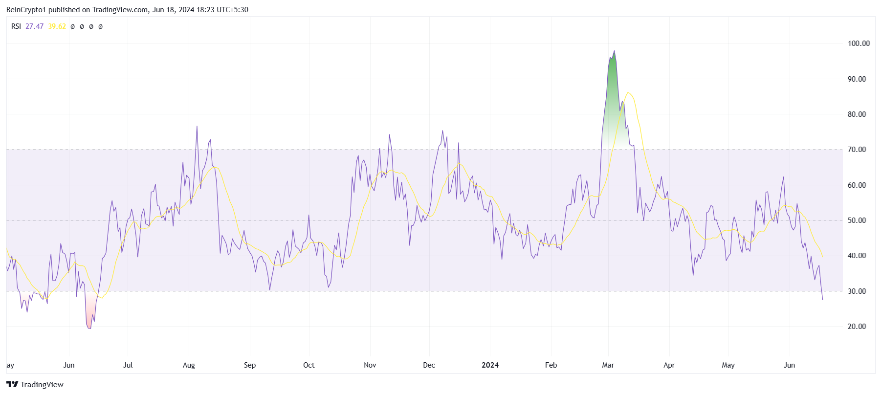 歴史的に、このようなRSIの位置は価格回復の前兆であることが多い。資産のRSIが30を下回ると、一般的に売り圧力が過剰になり、反転や反発の可能性があることを示す。