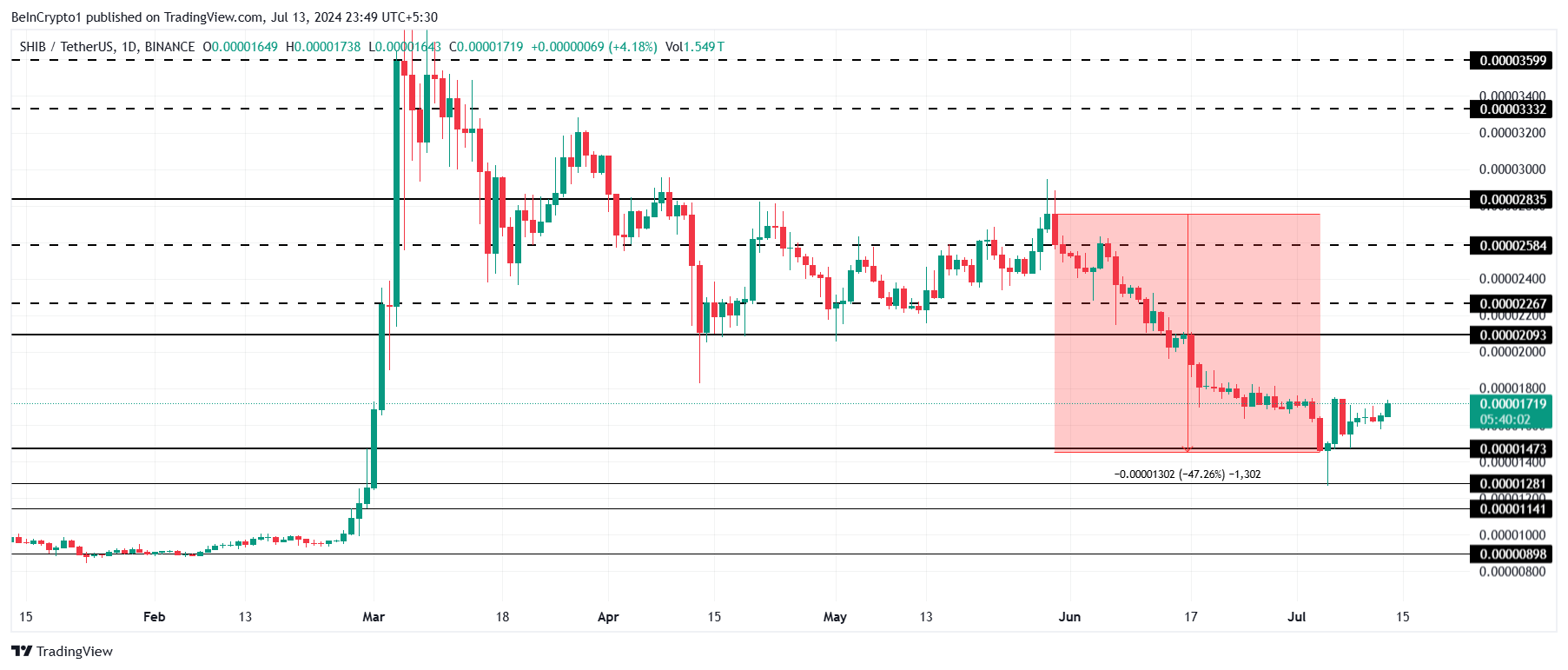 0.00001719ドルで取引されているShiba Inuの価格は 、安値0.00001473ドルからの最小限の反発を観察している。暗号資産の次のレジスタンスは0.00001800ドルにあり、これを突破すると0.00002903ドルまで上昇する可能性があります。