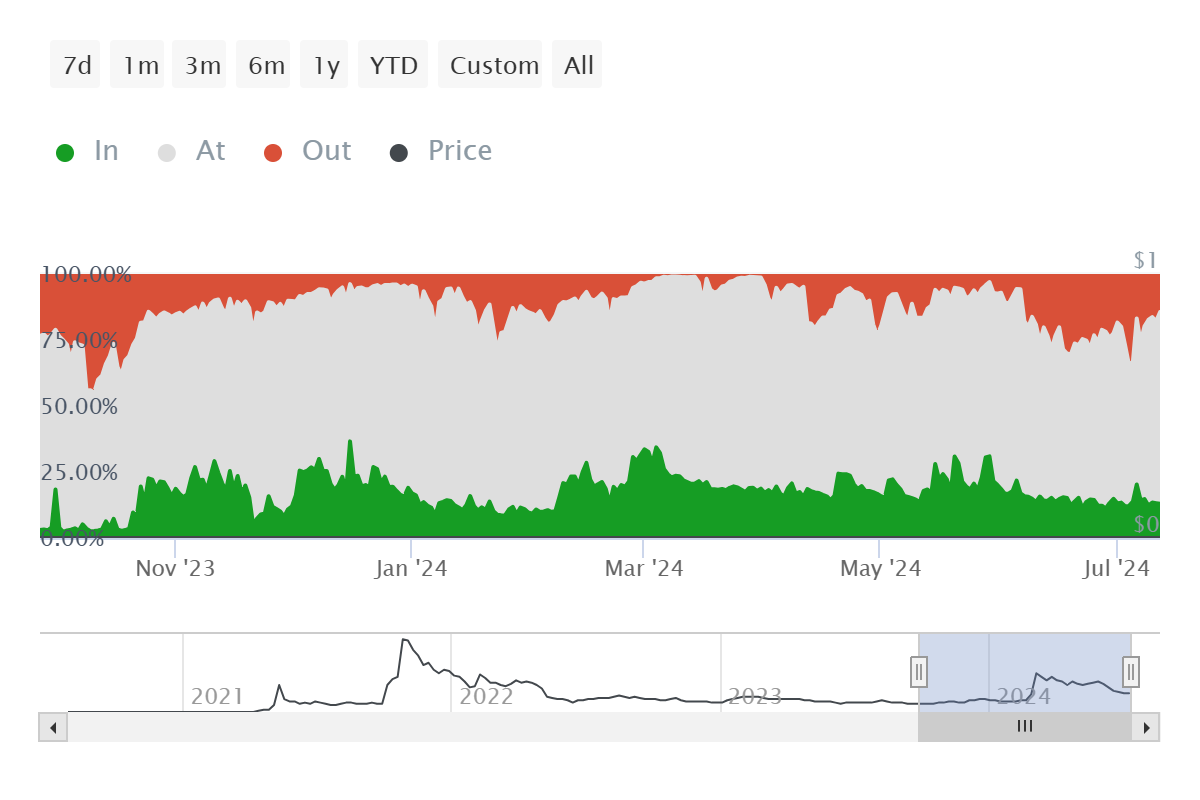一般的に、利益を上げている投資家がネットワークへの参加率が25%を超えると、売りの確率が上昇する。これは、これらの投資家が保有資産の利益を計上しようとする傾向があるためである。しかし、SHIBの場合、この支配率は13.5%未満であるため、投資家は売りにはあまり熱心ではない。