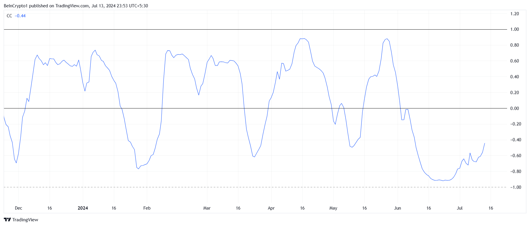 したがって、相関関係がプラスに転じた場合、ミームコインの成長が期待できる。