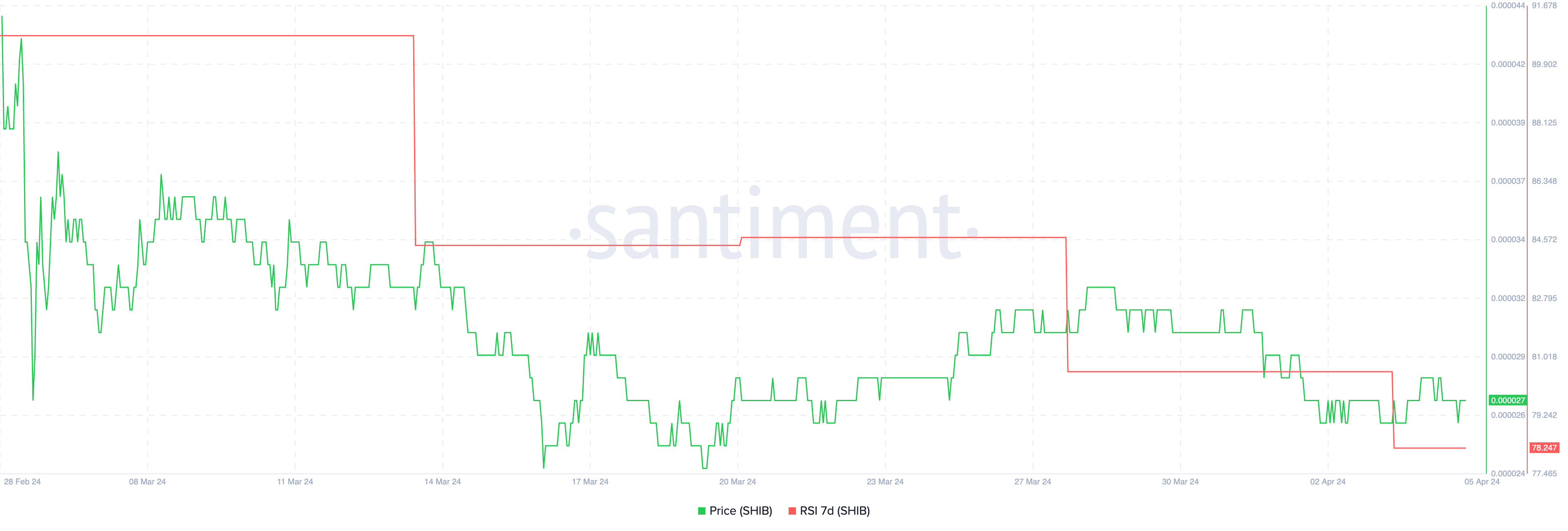 RSIは買われ過ぎゾーンで推移してきたが、最近90から78に低下した。このRSIの低下は、依然として買われすぎの状態を示しつつも、柴犬コインの背後にある買いの勢いの鈍化を示唆している。