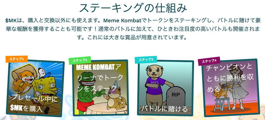 Meme KombatのネイティブMKトークンを使うことで、プレイヤーは試合結果を予想することができ、290%と大規模なAPY(年間利回り)で、ステーキング報酬を得ることができます。
