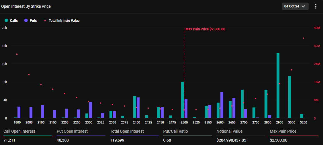 同時に、イーサリアムのオプション市場も119599件の契約で満期を迎えます。本日満期のイーサリアム契約はプット・トゥ・コール比率が0.68で、最大痛点は2500ドルです。