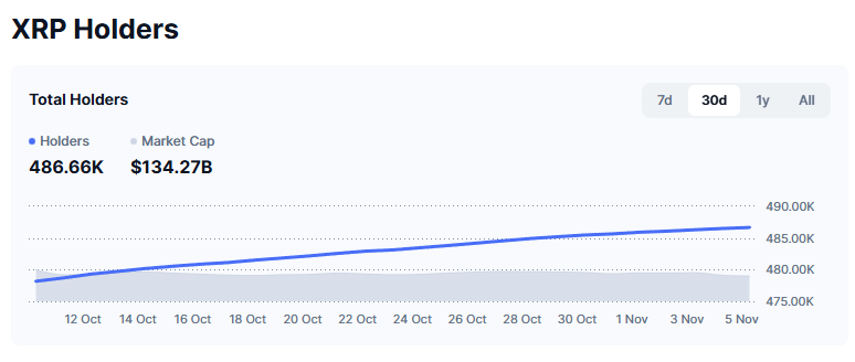 CoinMarketCapのデータによると、過去1か月でXRPの価格は3ドル以上から2ドル20セントに下落したが、保有者の数は8000以上増加した。