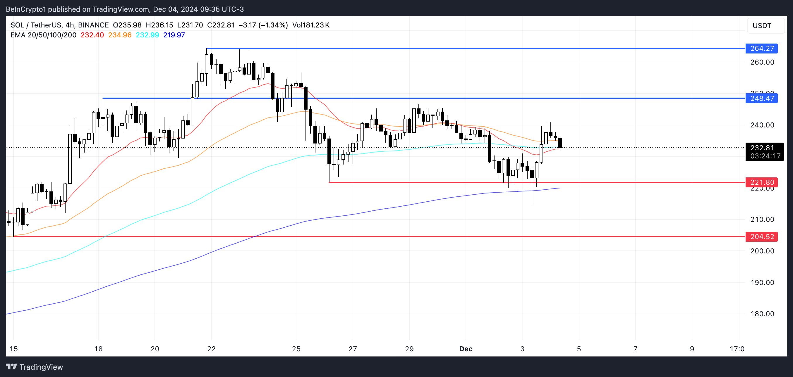 下降トレンドが発展した場合、SOLの価格は$221のサポートをテストし、このレベルが失敗した場合、さらに$204まで下落する可能性がある。一方、回復が起これば、ソラナは$248の重要なレジスタンスに向かう可能性がある。