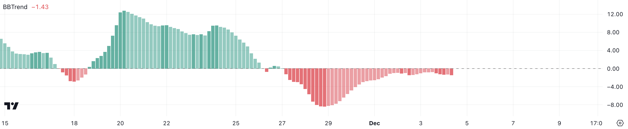 BBTrendは、ボリンジャーバンドに対する価格の勢いを測定し、ネガティブな値は下向きの圧力を示し、ポジティブな値は上向きのトレンドを示す。