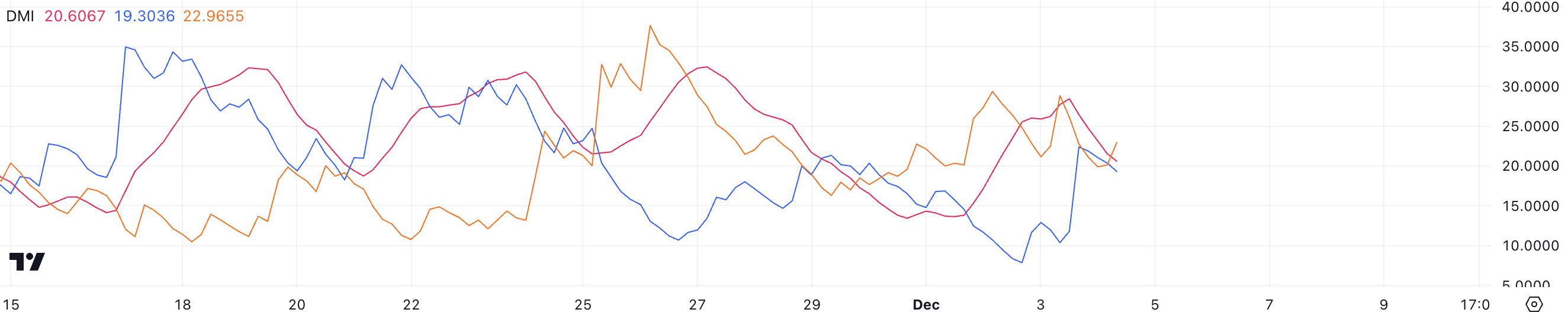 D+が買い圧力を、D-が売り圧力を表し、SOLの現在のDMIの読み取りは、市場が依然として弱気に傾いているが、確信が少なく、統合または勢いの変化の可能性を示唆している。