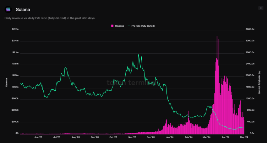 ソラーナの収益はここ数カ月で大幅に伸びており、3月にはピークを記録した。しかし同時に、P/Sレシオは2023年第4四半期の低収益期をはるかに下回っている。