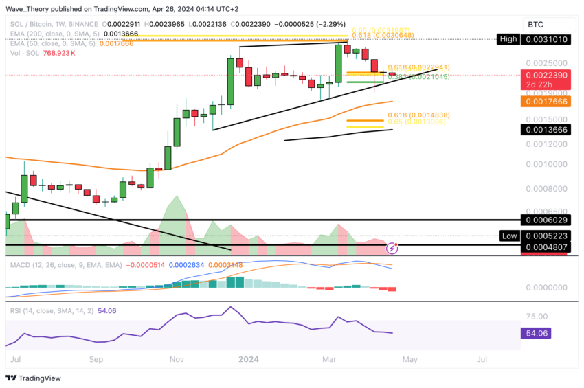 ビットコインに対して、Solanaは現在0.0021 BTCから0.0023 BTCの範囲でサポートされている。これは強気反発の可能性を示している。