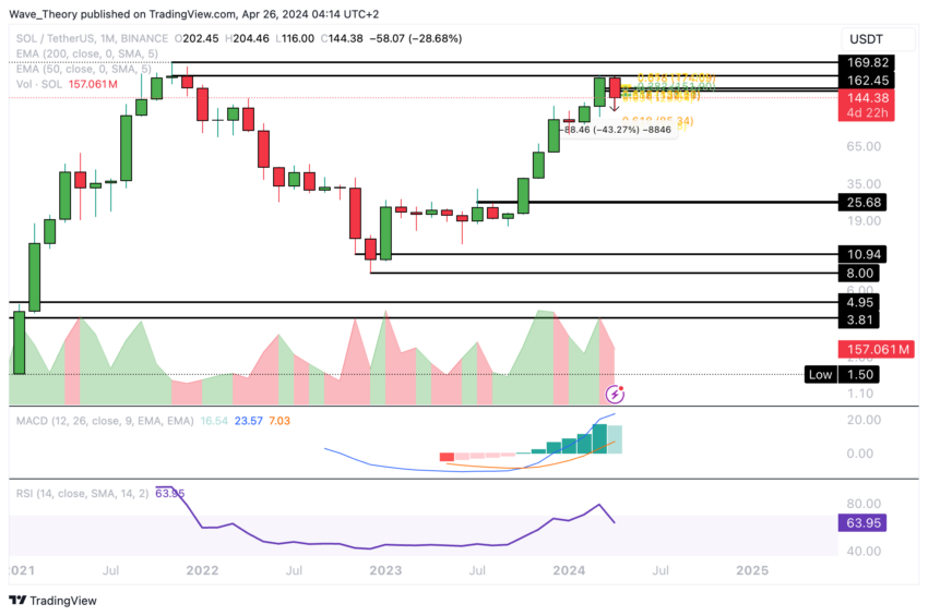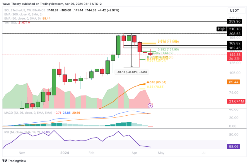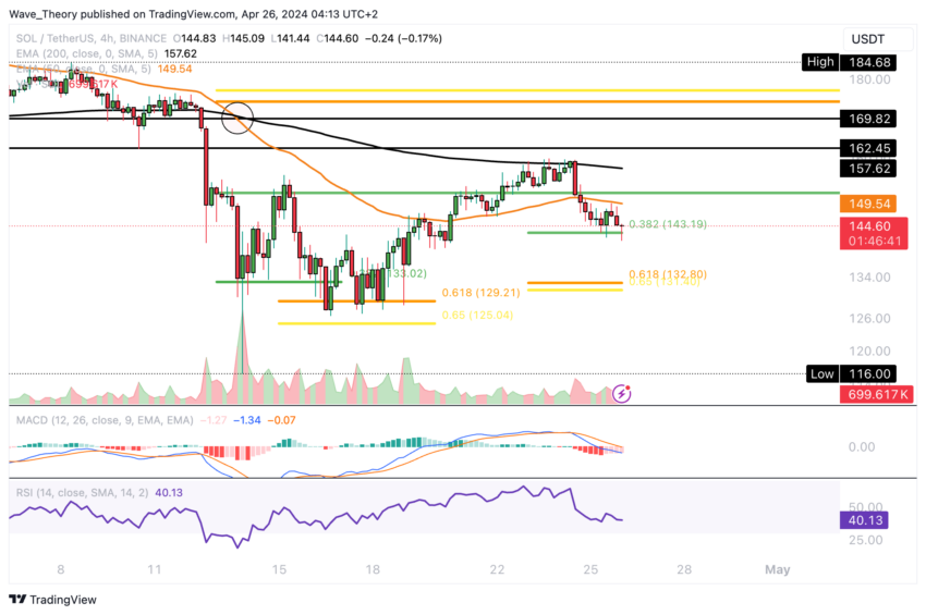 125ドル付近の黄金比サポートからの跳ね返りに続き、Solanaは一時155ドル付近の50日EMAまで急上昇したが、抵抗に直面し、再び調整局面を迎えた。現在、ソラナは143ドル付近で顕著なフィボナッチサポートを見つける。