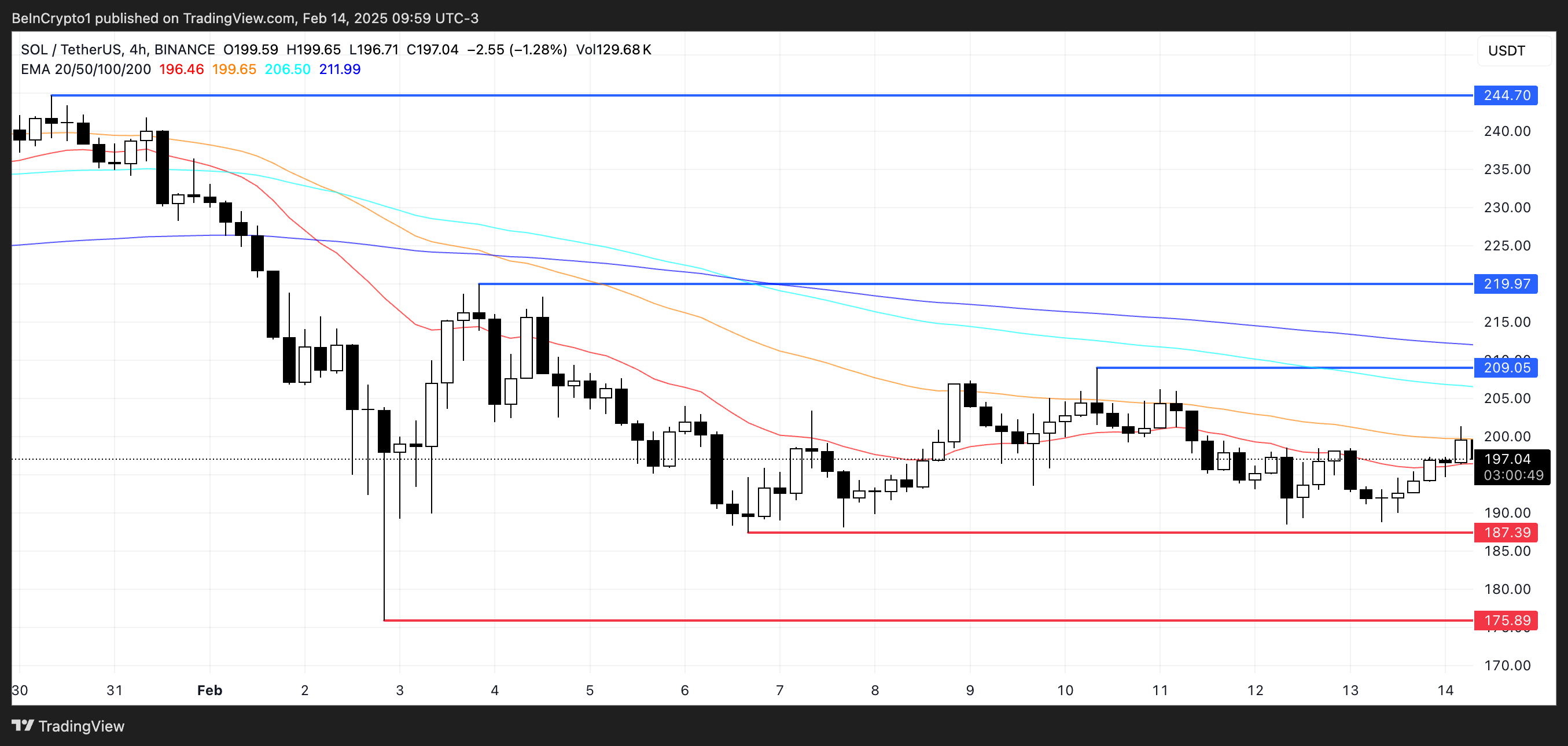 187ドルのサポートレベルまでの下落が考えられ、そこが保持できなければ、SOLはさらに175.8ドルまで下落する可能性がある。