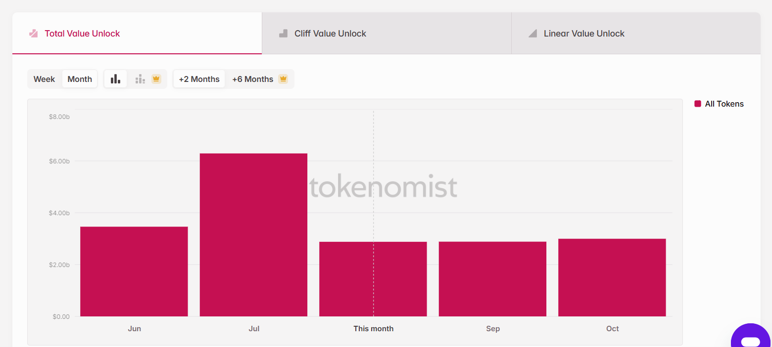 Tokenomistの最新データによると、8月に暗号資産市場でロックが解除される予定のトークンの総額は約30億ドルとなる。これは7月の63億ドルから大幅に減少している。しかし、それでもなお8月の解除イベントは今年最大規模の一つとされており、短期的には投資家心理や市場全体のボラティリティに重大な影響を及ぼす可能性があるとして、専門家は注意を呼びかけている。