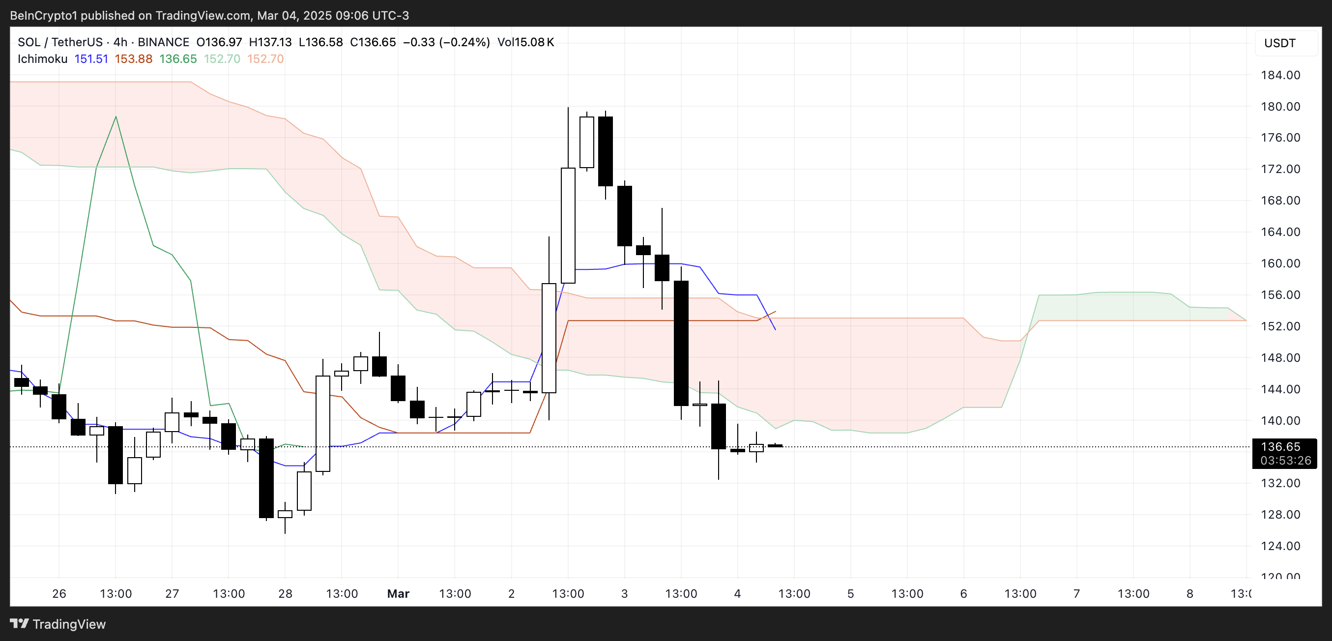 現在のレベルを維持できない場合、SOLはさらに下落する可能性がある。勢いを再び強気にするには、雲を上回る動きが必要である。