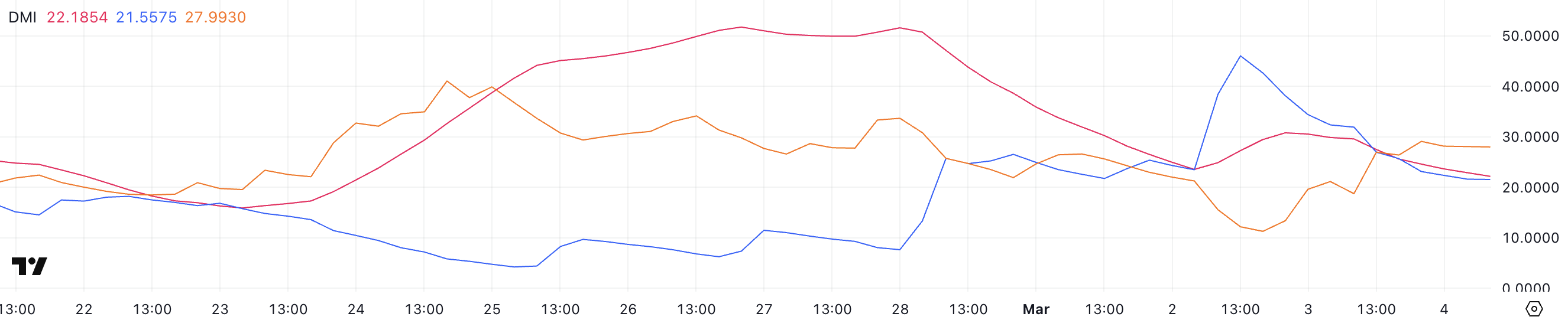 ADXはトレンドの強さを測定し、方向ではなく、市場の状態を示す重要な閾値を持つ。20未満の読み取りは弱いまたはレンジ相場を示し、25以上の値はトレンドの強化を示す。SOLの+DIは2日前の46から21.5に急落し、強気の圧力が減少していることを示している。