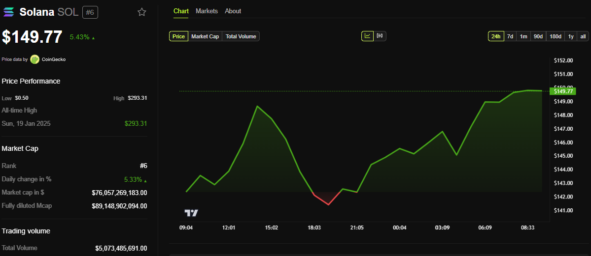 BeInCryptoのデータによれば、SOLは本稿執筆時点で149.77ドルで取引されており、過去24時間で5%以上上昇している。