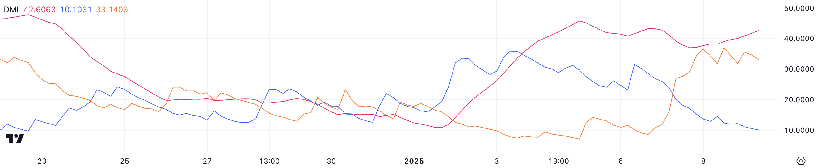 SOLの平均方向性指数(ADX)は現在42.6で、1日前の37から上昇しており、トレンドの強化を示しています。ADXは0から100のスケールでトレンドの強さを測定し、方向に関係なく、25以上の値は強いトレンドを示し、20未満の値は弱いまたは存在しない勢いを反映します。