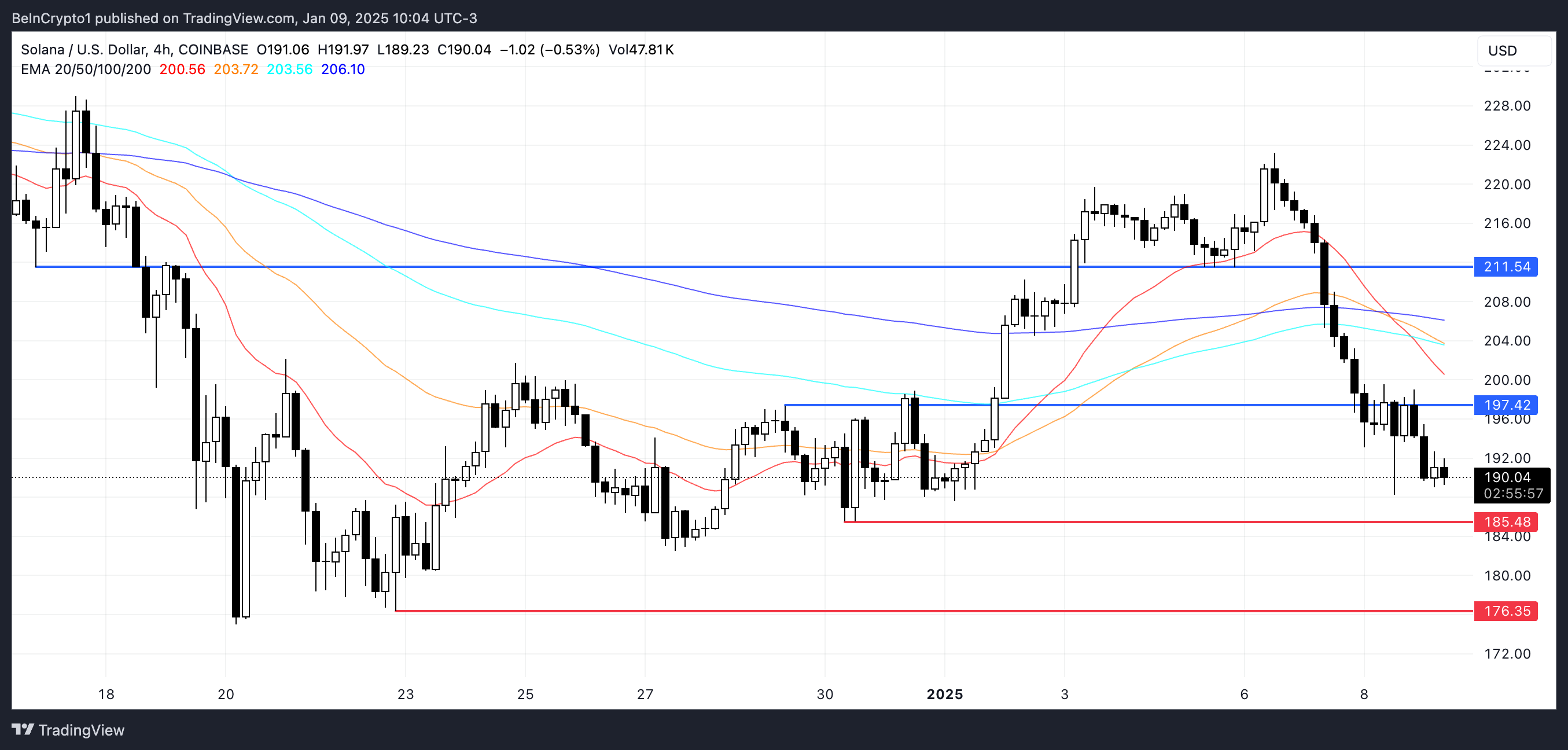 現在の下落トレンドが続く場合、SOL価格は185ドルの重要なサポートレベルをテストする可能性があります。このレベルを維持できない場合、次の重要なターゲットである176ドルへのさらなる下落につながる可能性があります。