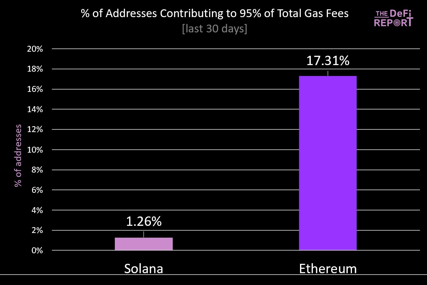 ナドー氏によれば、過去30日間で、イーサリアムの手数料の95%を生成したアドレスは17.31%である。ソラナの場合、その数字は驚くほど小さく、わずか1.26%である。