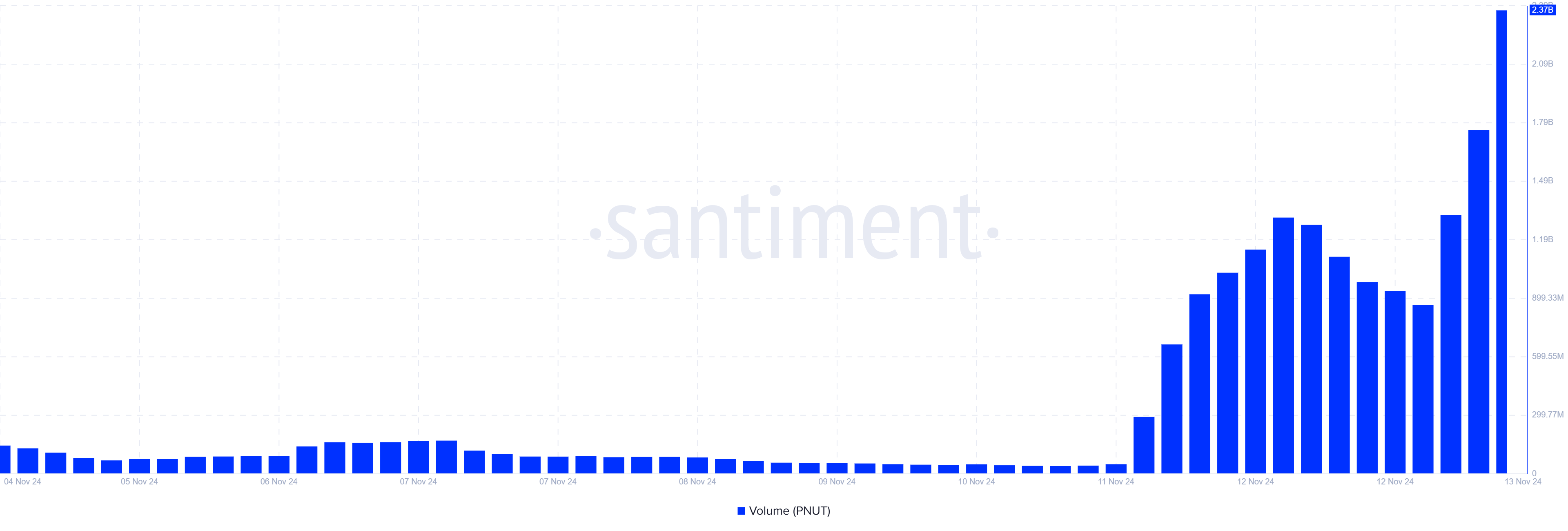 PNUTへの需要は、その取引量の急増に明確に反映されており、36時間で690%増加した。当初、PNUTの取引量は2億9100万ドルであったが、23億ドルに急増し、このミームコインへの関心の高まりを示している。取引量の急増は、特にPNUTの最近の発売を考えると、投資家の間での関心の高まりを示唆している。
