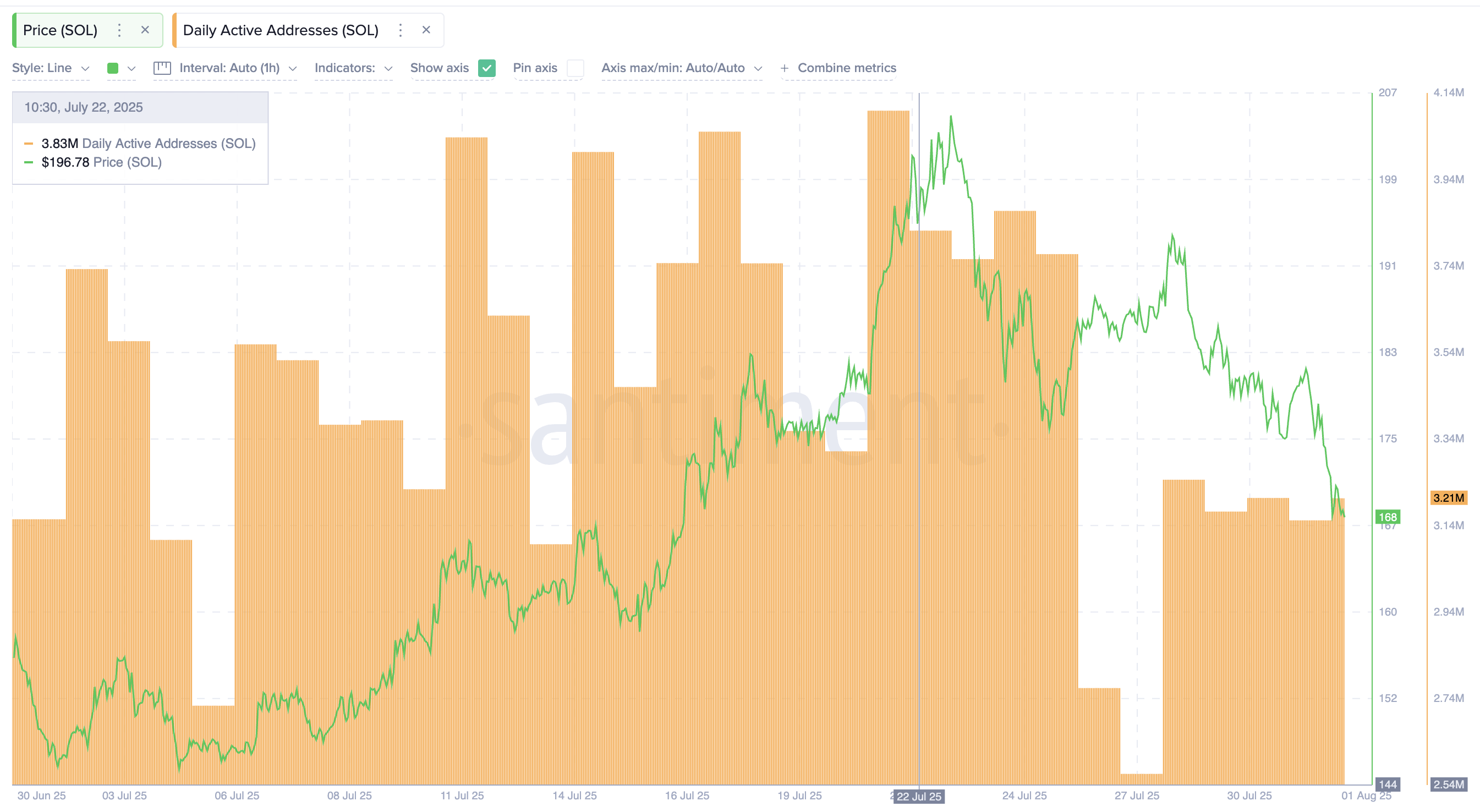 ソラナの日次アクティブアドレス数は7月21日に410万に達し、その後SOLの価格は200ドルを超えた。これは強力なネットワーク活動がラリーを支えていたことを示している。